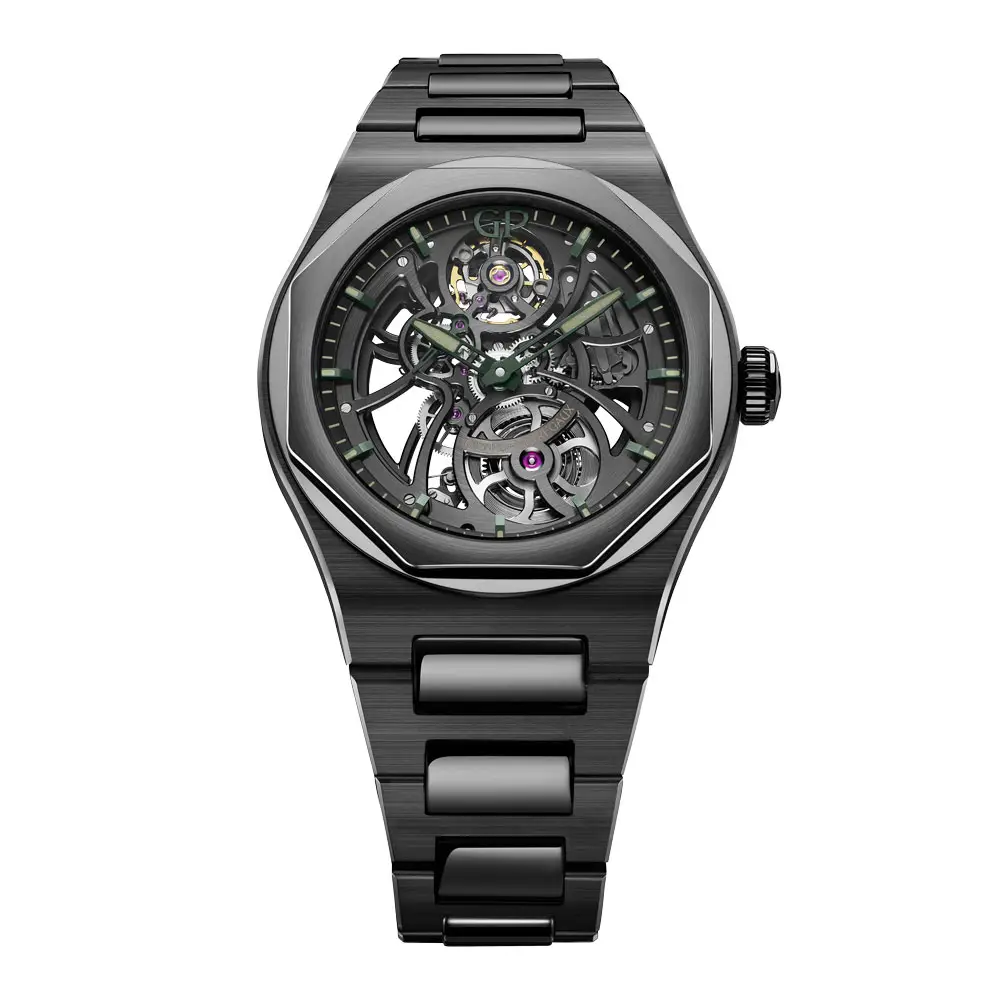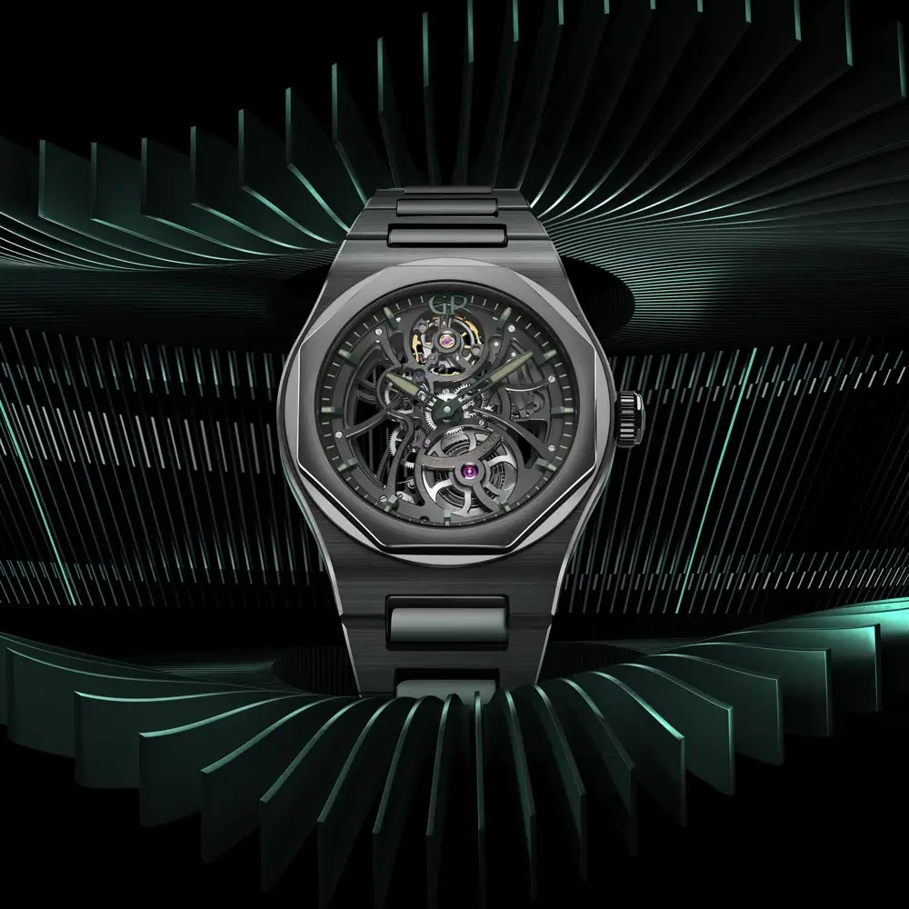 Hodinky zaujmou skeletonizovaným ciferníkem s výhledem na vnitřní mechaniku – manufakturní kalibr GP01800-2627. Tento automatický strojek má rezervu chodu 54 hodin, pracuje na frekvenci 28 800 polokmitů za hodinu a je zakončen elegantním rotorem z růžového zlata, zdobeným motivem Aston Martin. Indexy i ručičky jsou opatřeny zeleným PVD povrchem s luminiscencí v barvě Aston Martin Racing Green, která dodává hodinkám výrazný sportovní nádech.