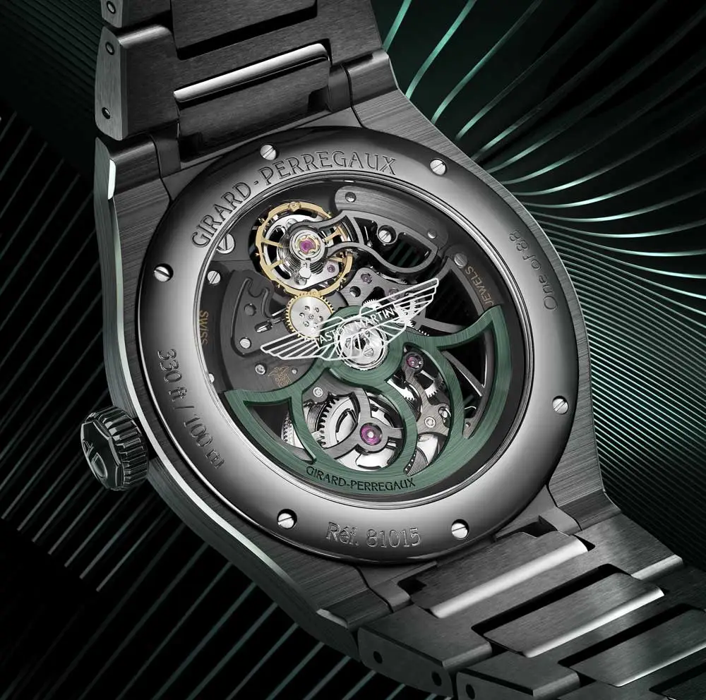 Model je vybaven safírovým sklíčkem s antireflexní úpravou, transparentním dýnkem s metalizovaným logem Aston Martin a vodotěsností do 100 metrů, což z něj činí nejen sběratelský kousek, ale i funkční hodinky pro každodenní nošení. Každý detail potvrzuje vysokou řemeslnou úroveň značky Girard‑Perregaux i hluboký respekt k automobilovému designu.