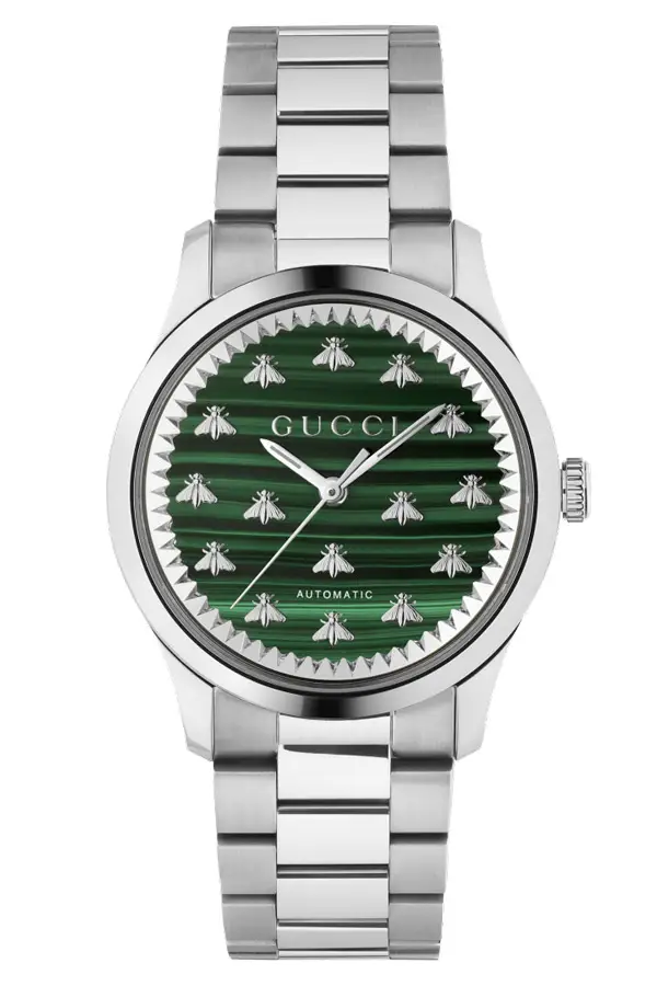 Gucci G-Timeless Multibee — это роскошные мужские часы, сочетающие в себе итальянскую элегантность, швейцарскую точность и современный стиль. На малахитовом зелёном циферблате расположены 15 миниатюрных серебряных пчёл, ставших одним из знаковых символов Gucci, символизирующих утончённость и индивидуальность.