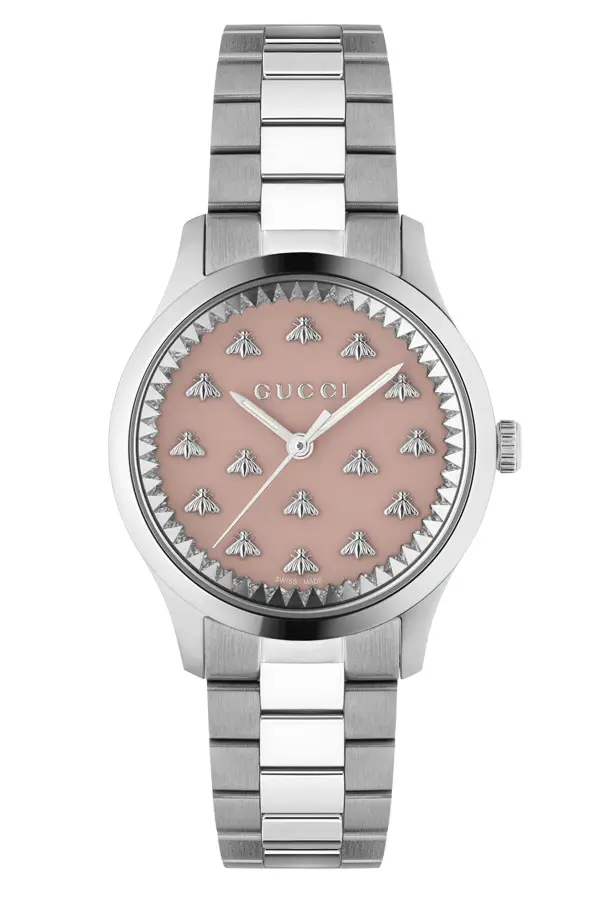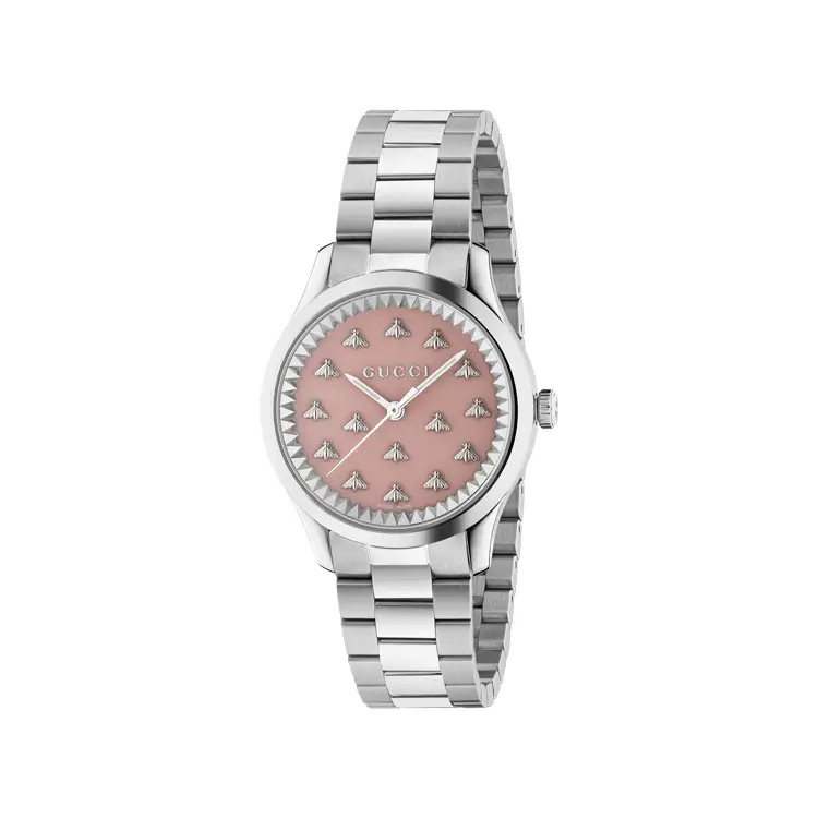Gucci G-Timeless Multibee YA1265033 — элегантная модель, сочетающая современную эстетику с фирменным почерком бренда. На запястье — круглый корпус 32 мм из нержавеющей стали, сапфировое стекло и строгий стальной безель. Свежий акцент создаёт розовый аналоговый циферблат, гармонирующий со стальным браслетом (серебристый тон) с раскладывающейся застёжкой — вне́временная комбинация на каждый день.