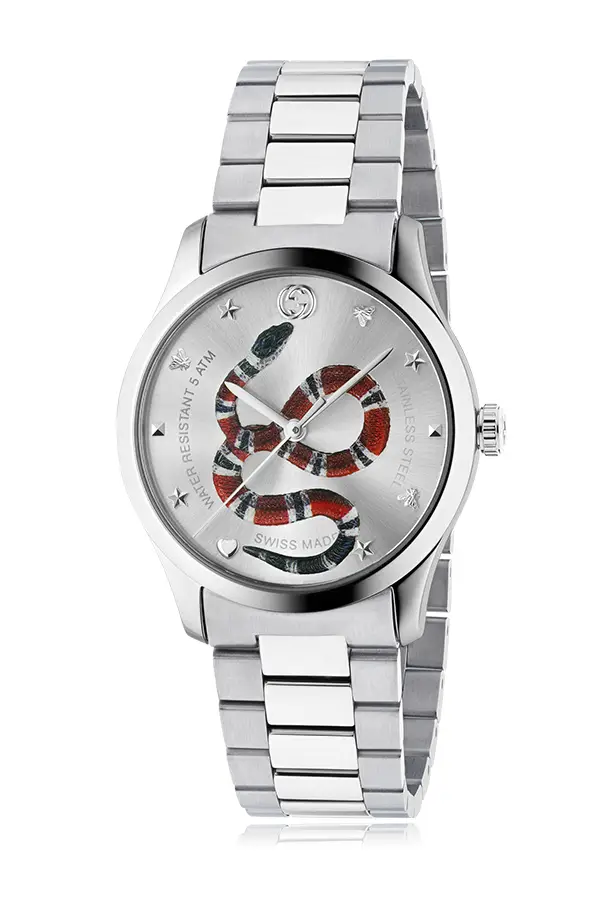 За точность отвечает кварцевый механизм. Для повседневной уверенности предусмотрена водозащита 5 ATM / 50 м, подходящая для обычного контакта с водой. Gucci G-Timeless YA1264076 — стильный, универсальный и надёжный выбор в чистой стальной эстетике.