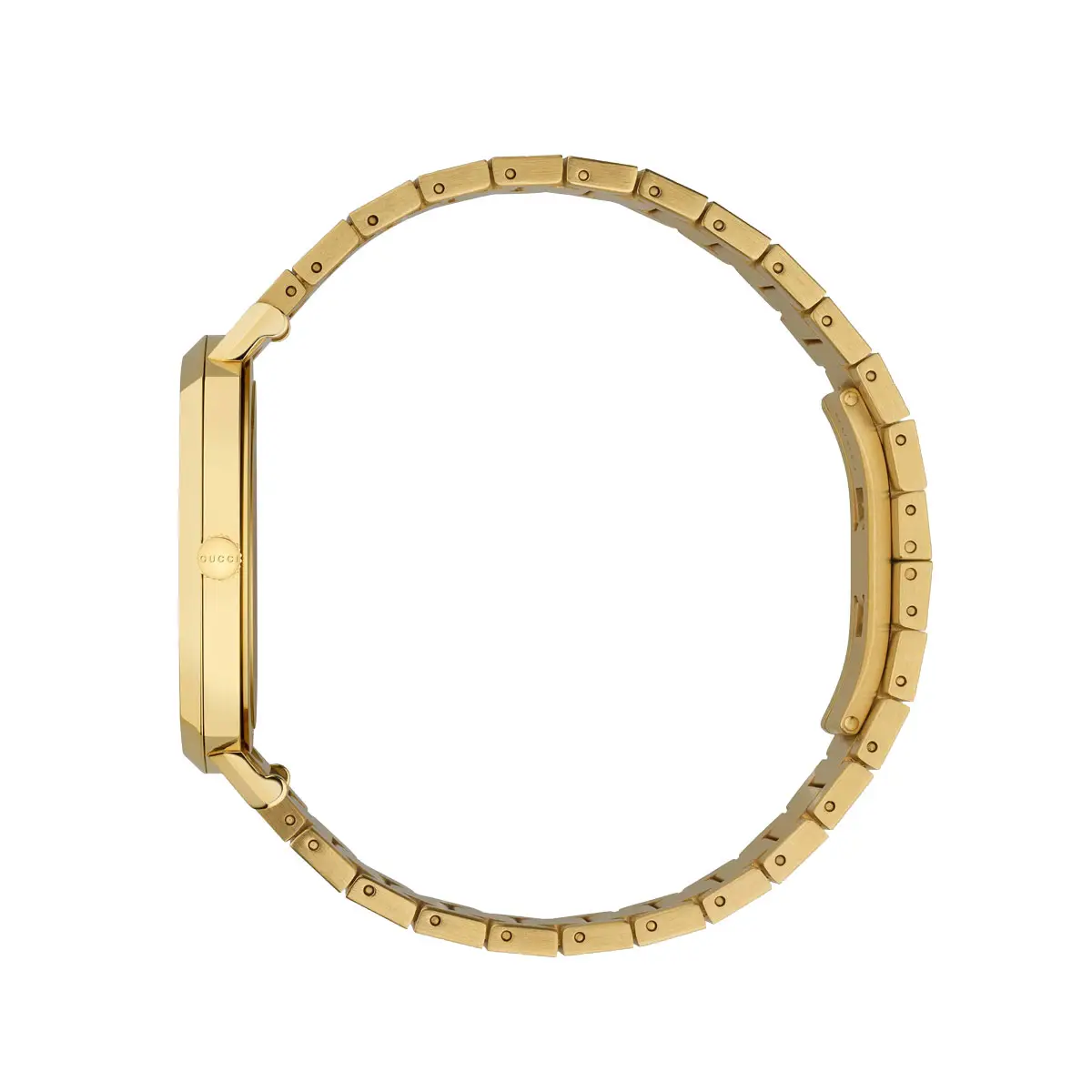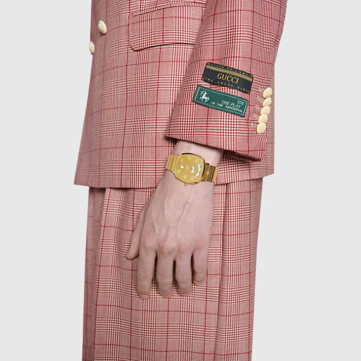 Gucci Grip YA157409 — эффектная модель, объединяющая современный минимализм с фирменной эстетикой бренда. Часы оснащены квадратным корпусом 38 мм из стали / желтого золотого покрытия, сапфировым стеклом и безелем из стали / желтого золотого покрытия. Образ дополняет стальной браслет с желтым золотым покрытием (золотистый тон) и раскладывающаяся застёжка, благодаря чему часы выглядят компактно и роскошно на запястье.
