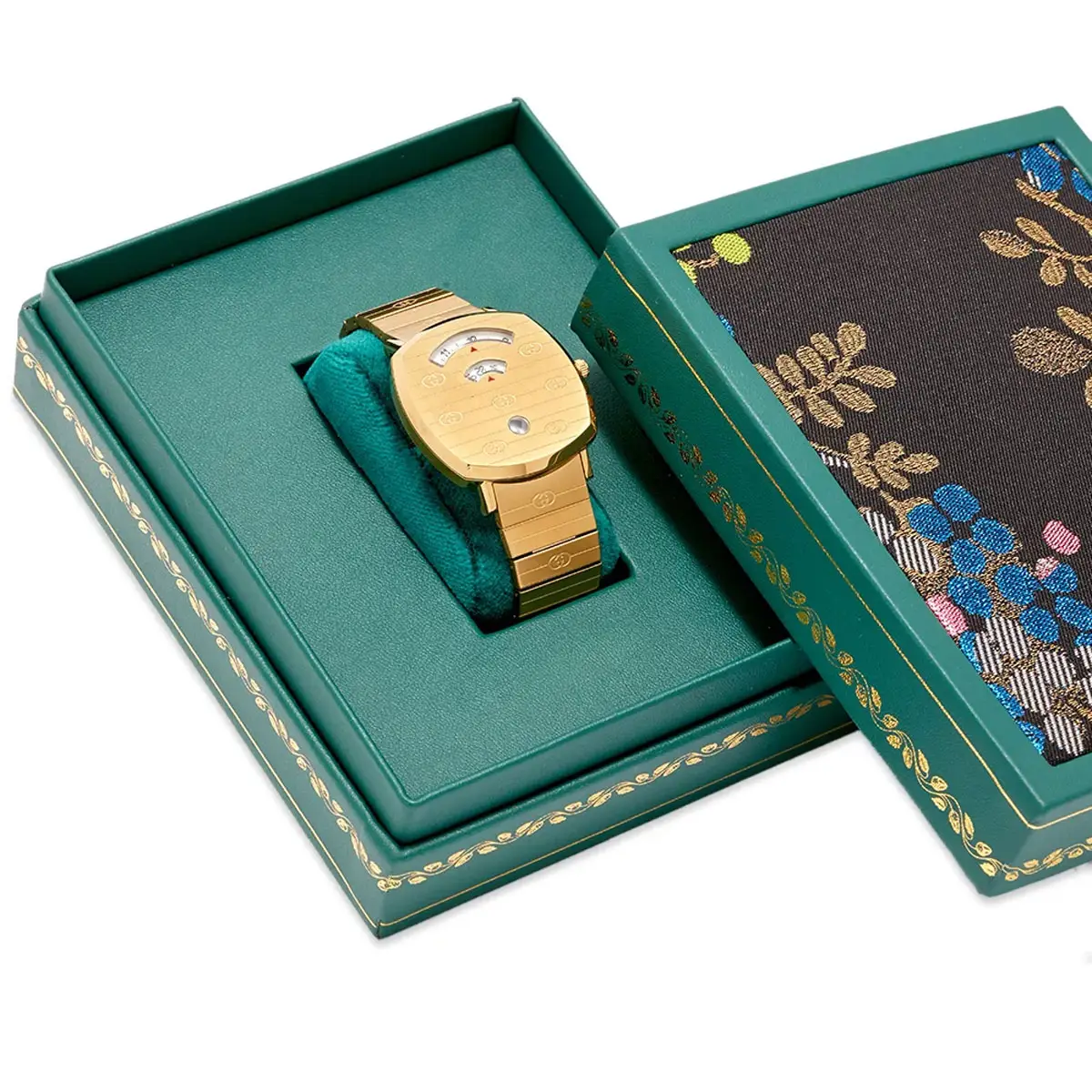 На золотистом аналоговом циферблате расположено окно даты; за точность отвечает кварцевый механизм Ronda. На каждый день предусмотрена водозащита 3 ATM / 30 м, подходящая для обычного контакта с водой. Gucci Grip YA157409 — выбор для тех, кто ценит стильные, выразительные и надёжные часы с узнаваемым характером.