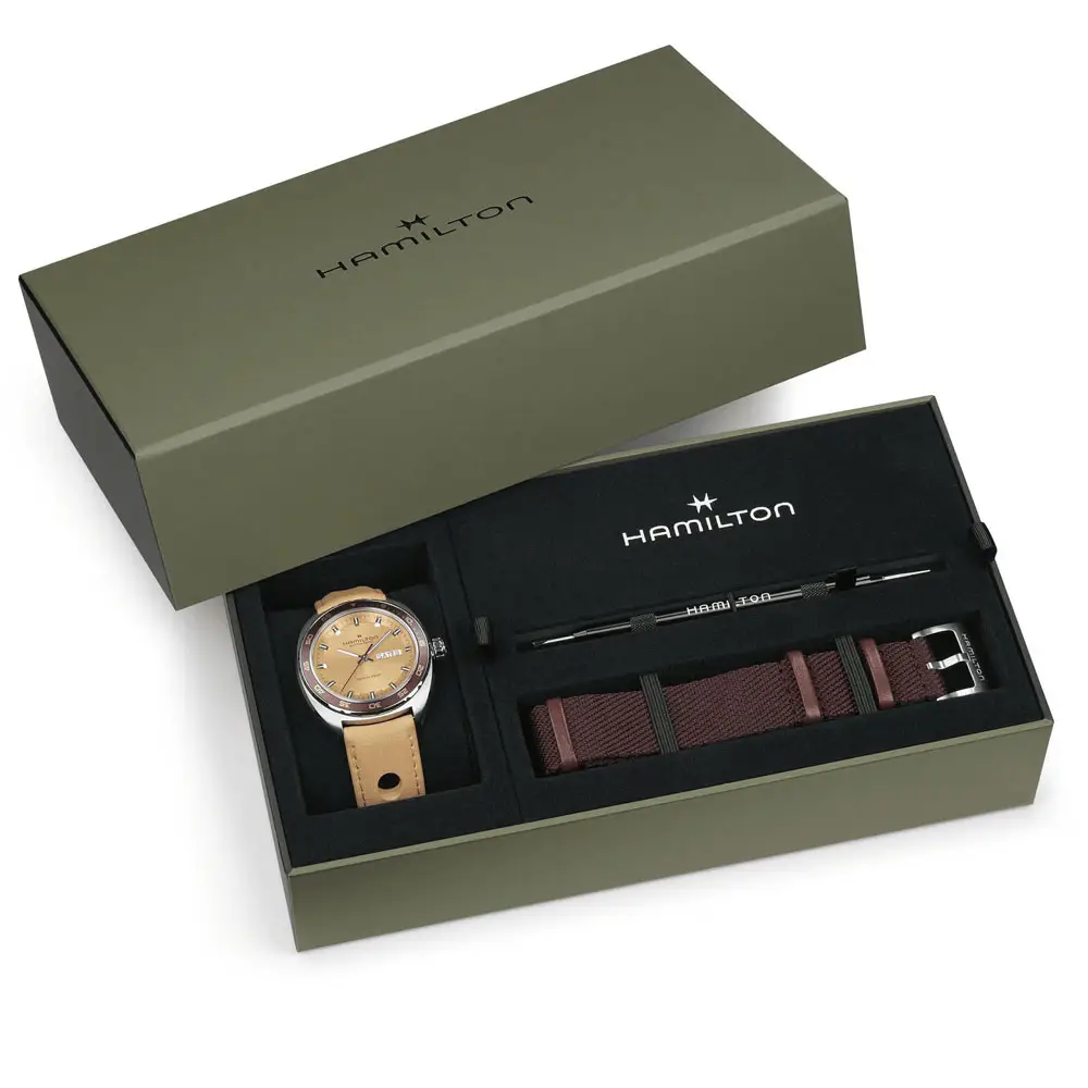 Модель обладает водонепроницаемостью до 5 ATM (50 м) и дополнена удобным бежевым кожаным ремешком с раскладывающейся застёжкой, гармонично дополняющим винтажный облик. Hamilton Pan Europ – идеальный выбор для мужчин, которые ценят яркий, но в то же время вневременной стиль с отсылкой к гоночному наследию бренда.