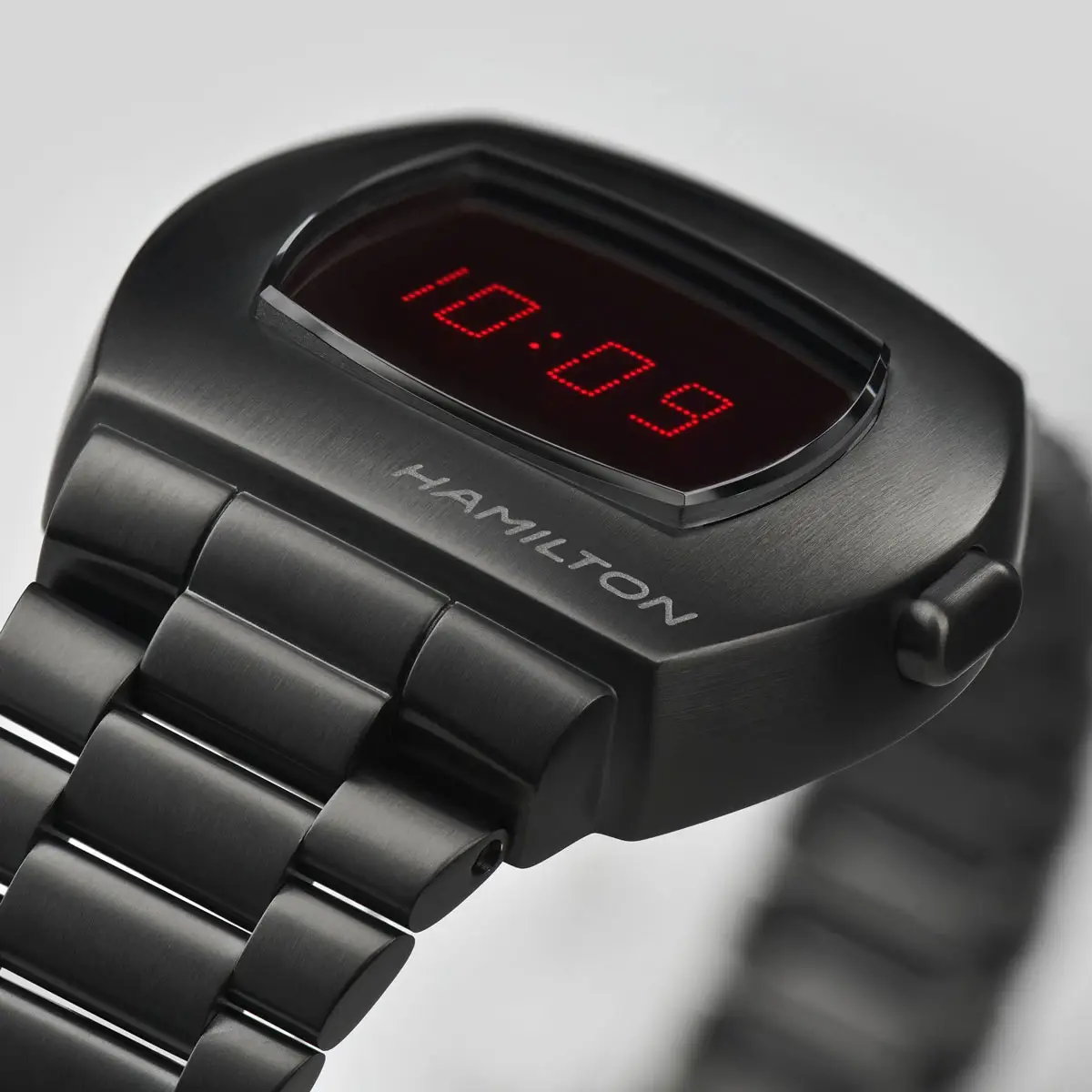 Hamilton American Classic PSR Digital Quartz H52404130 — это культовые цифровые часы, отдающие дань революционному дизайну 70-х годов. Прямоугольный корпус размером 40,8 × 34,7 мм с чёрным PVD-покрытием из нержавеющей стали сочетает в себе футуризм и элегантную сдержанность.
