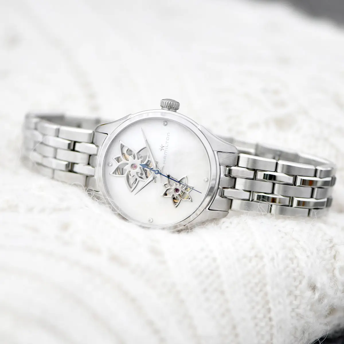 Для романтически настроенных женщин бренд Hamilton выпустил женские часы Jazzmaster Open Heart Automatic H32115192, которые впечатляют прежде всего своей нетрадиционной обработкой. Жемчужно-белый циферблат украшен двумя изящными цветками, из которых также виден часовой механизм. Каждая четверть часа отмечена блестящим бриллиантом. Полностью стальная конструкция гарантирует долгий срок службы.