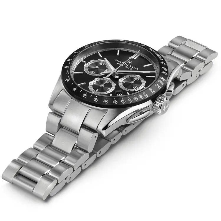 Под чёрным спортивно-элегантным циферблатом скрывается механизм с автоматическим подзаводом, обеспечивающий плавный и точный ход. Модель оснащена индикатором даты и хронографом для измерения коротких промежутков времени. Каждый элемент отражает стремление Hamilton к качеству, инновациям и техническому совершенству.