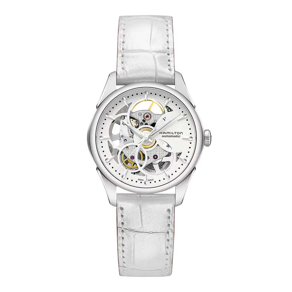Элегантный белый кожаный ремешок подчёркивает женственный характер часов и обеспечивает комфорт. Jazzmaster Skeleton Lady H32405811 — отличный выбор для женщин, которые ищут стильные, выразительные и высококачественные механические часы.