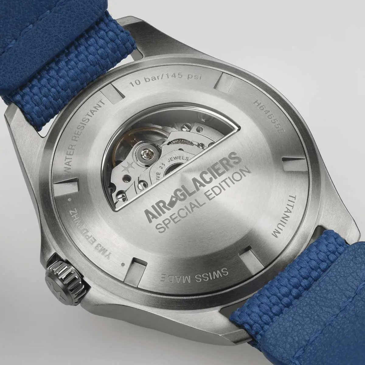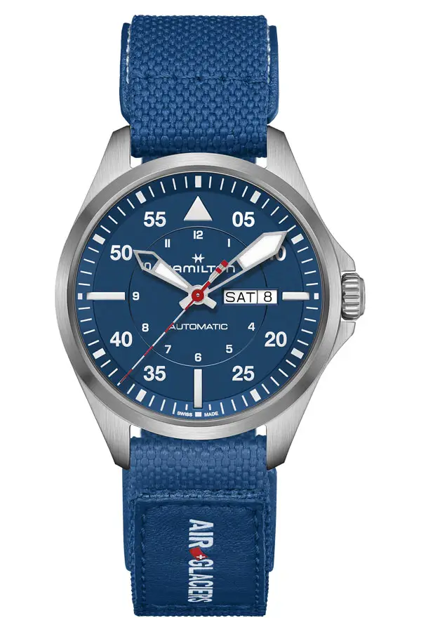 Модель водонепроницаема до 10 ATM (100 м) и укомплектована синим текстильным ремешком с классической пряжкой, который обеспечивает комфорт, износостойкость и спортивный стиль. Hamilton Khaki Aviation Air-Glaciers Edition – идеальный выбор для тех, кто ценит лёгкость, прочность и настоящее пилотское наследие.