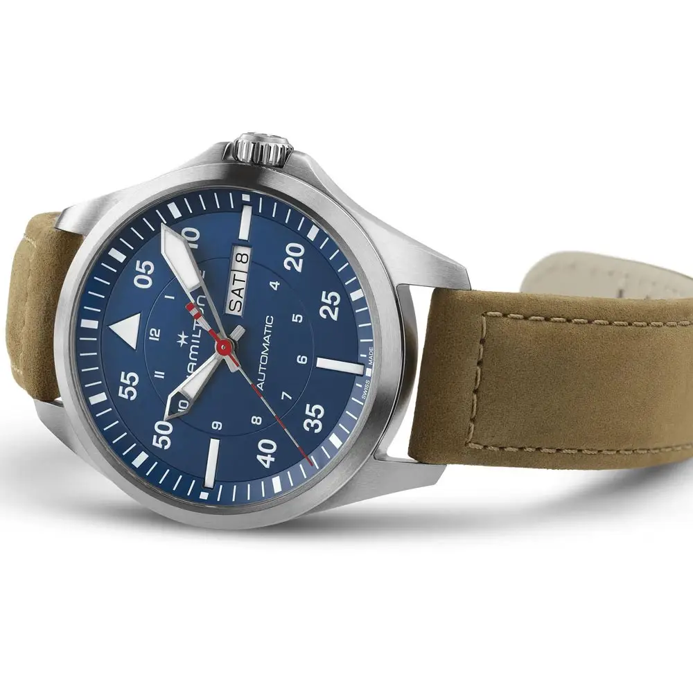 Синий аналоговый циферблат с крупными цифрами и светящимися стрелками обеспечивает отличную видимость, а также включает индикацию дня недели и даты – полезную функцию для пилотов и путешественников. Внутри установлен надёжный автоматический калибр H-30 с впечатляющим резервом хода до 80 часов, что гарантирует долгую работу даже без ежедневной подзаводки.