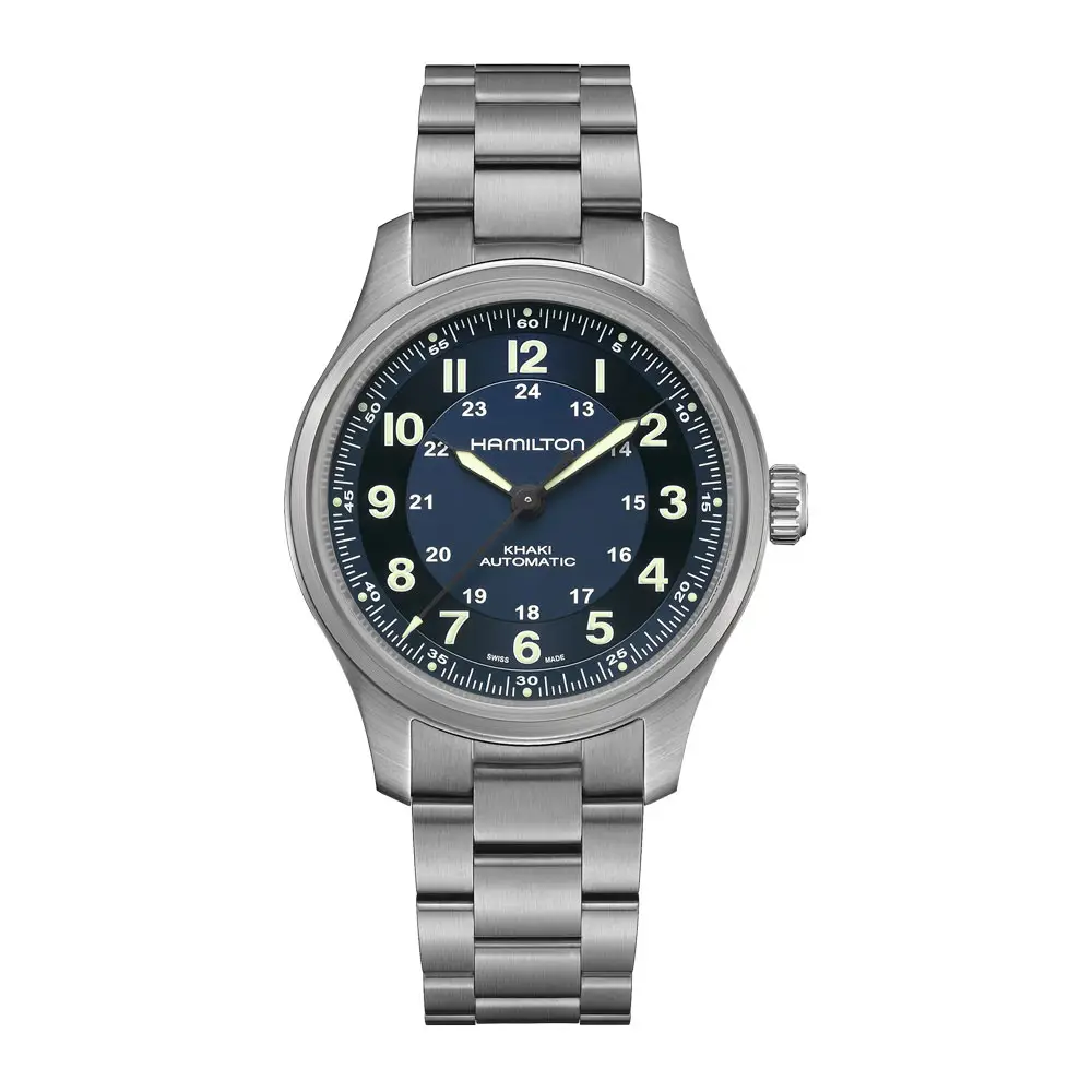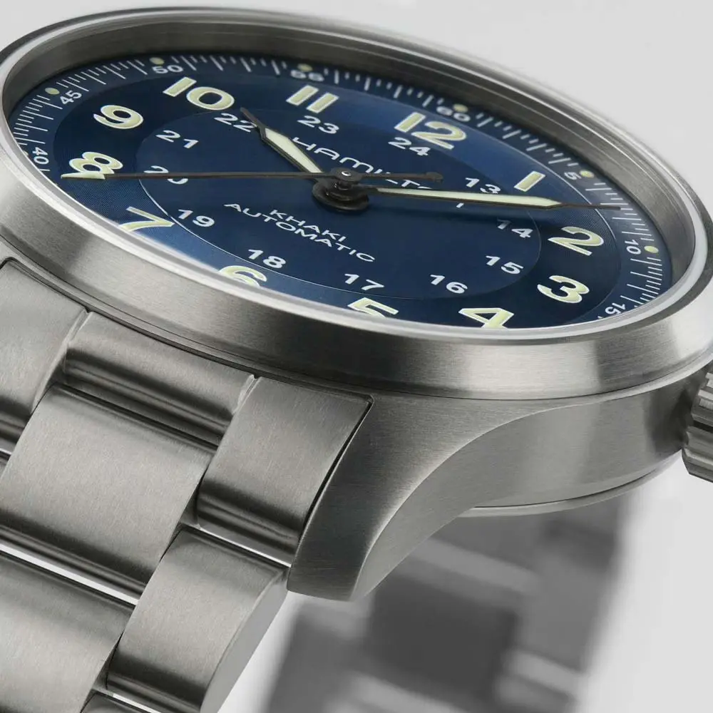 Hamilton Khaki Field Titanium Auto H70545140 - прочная модель для активного отдыха, вдохновленная военным дизайном. Корпус диаметром 42 мм изготовлен из легкого и прочного титана, а титановый браслет обеспечивает максимальный комфорт при ношении. Матовый синий циферблат с выразительными арабскими цифрами обеспечивает отличную читаемость даже в сложных условиях.