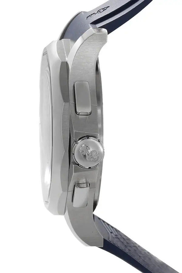 Модель водонепроницаема до 5 ATM / 50 метров, что делает её подходящей для ежедневной носки и отдыха. Общий спортивный вид дополняет стильный синий каучуковый ремешок с практичной раскладывающейся застежкой, обеспечивающей комфорт и безопасность при ношении.