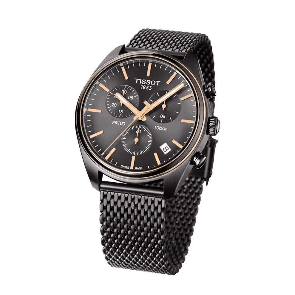 Tissot PR 100 Chronograph T101.417.23.061.00 сочетает элегантность, спортивный стиль и швейцарскую точность. Корпус из нержавеющей стали диаметром 41 мм дополняет серый циферблат с розово-золотыми деталями, тремя счётчиками хронографа и окном даты на отметке “4 часа”, создавая современный и гармоничный образ.
