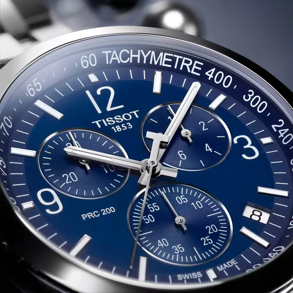 Tissot PRC 200 Chronograph T114.417.11.047.00 сочетает спортивную элегантность, мощность и швейцарскую точность. Корпус из нержавеющей стали диаметром 43 мм обрамляет синий циферблат с тремя счётчиками хронографа, люминесцентными стрелками и метками, обеспечивающими отличную читаемость при любом освещении.