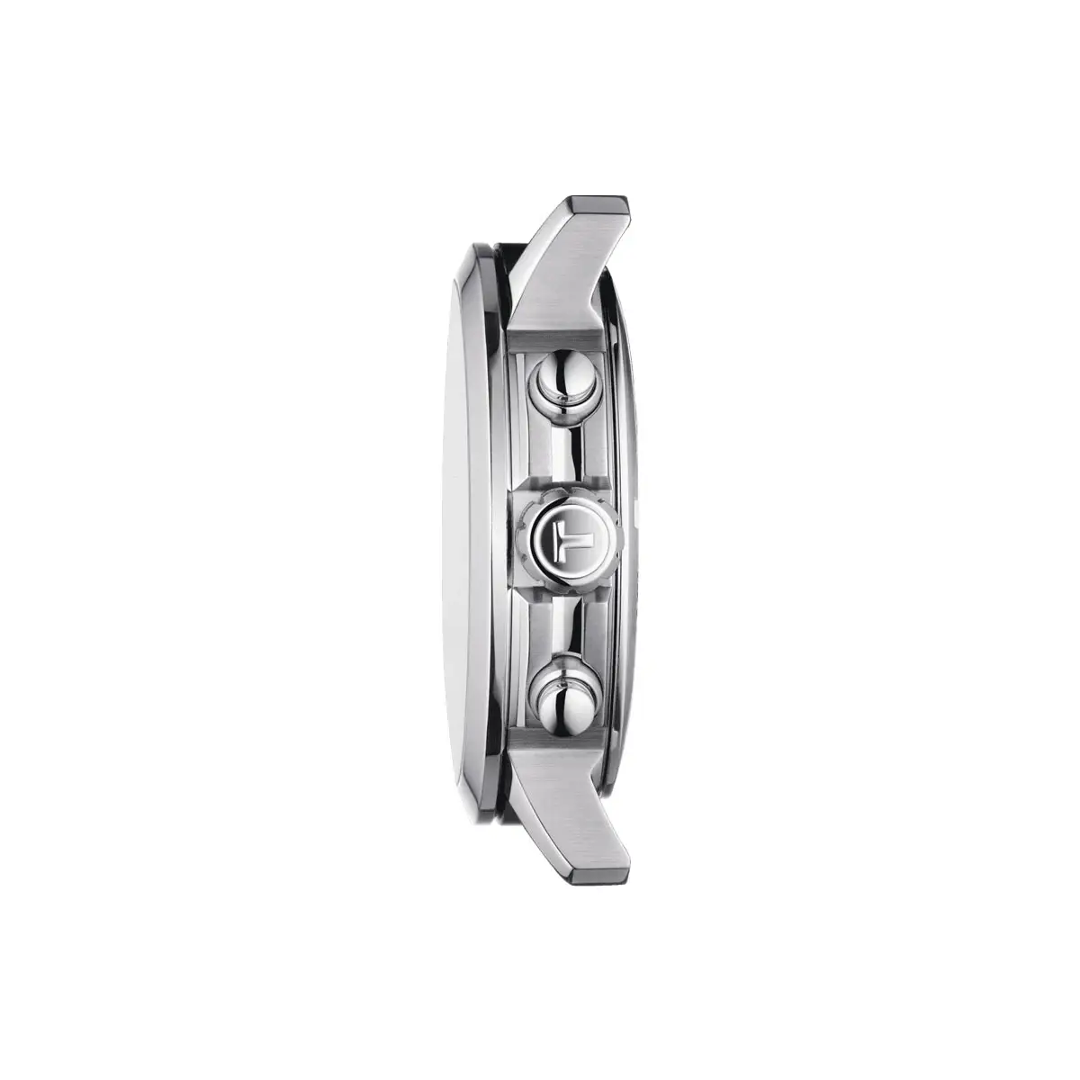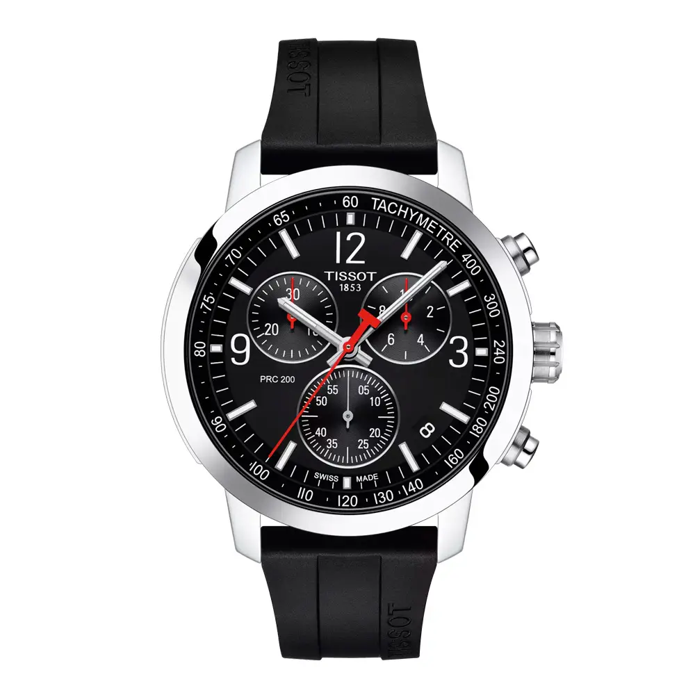 Tissot PRC 200 Chronograph сочетает в себе швейцарскую точность и спортивную элегантность. Корпус из нержавеющей стали диаметром 42 мм обрамляет чёрный циферблат с белыми метками и красными акцентами, придающими модели динамичный характер.