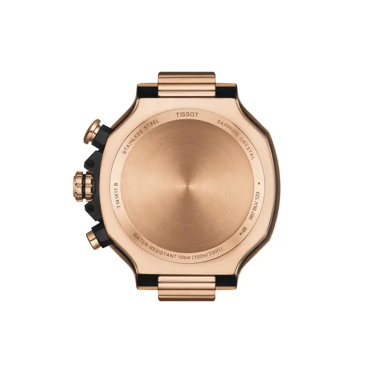 Tissot T-Race Chronograph T141.417.37.051.00 — спортивная модель, вдохновлённая миром мотогонок. Прочный корпус 45 мм из нержавеющей стали 316L с розово-золотым PVD-покрытием сочетается с чёрным циферблатом, контрастные детали которого подчёркивают динамику и мощь. Элементы дизайна, такие как безель в форме тормозного диска и кнопки, напоминающие руль, отсылают к гоночной тематике коллекции.