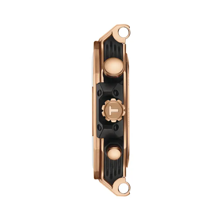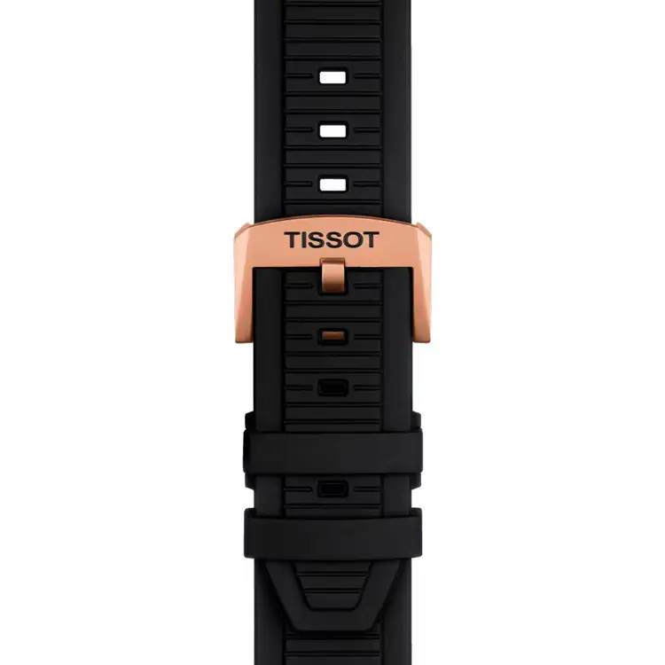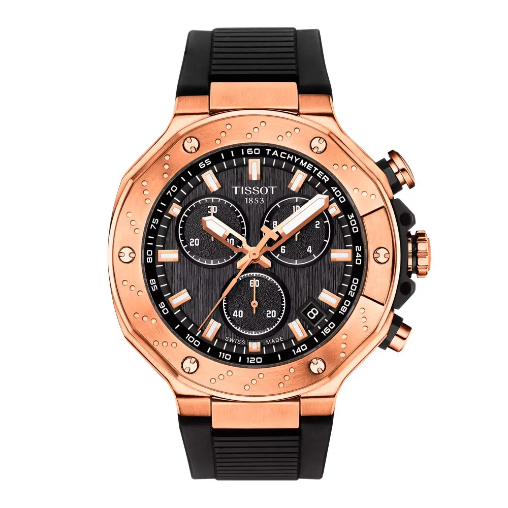 Чёрный каучуковый ремешок обеспечивает комфорт и спортивный вид. Tissot T-Race Chronograph, сочетающий чёрный и розовое золото, воплощает энергию, точность и швейцарское качество, созданное для тех, кто ценит мощь и стиль.