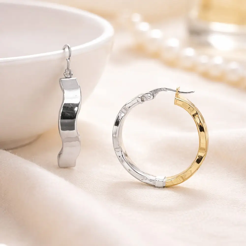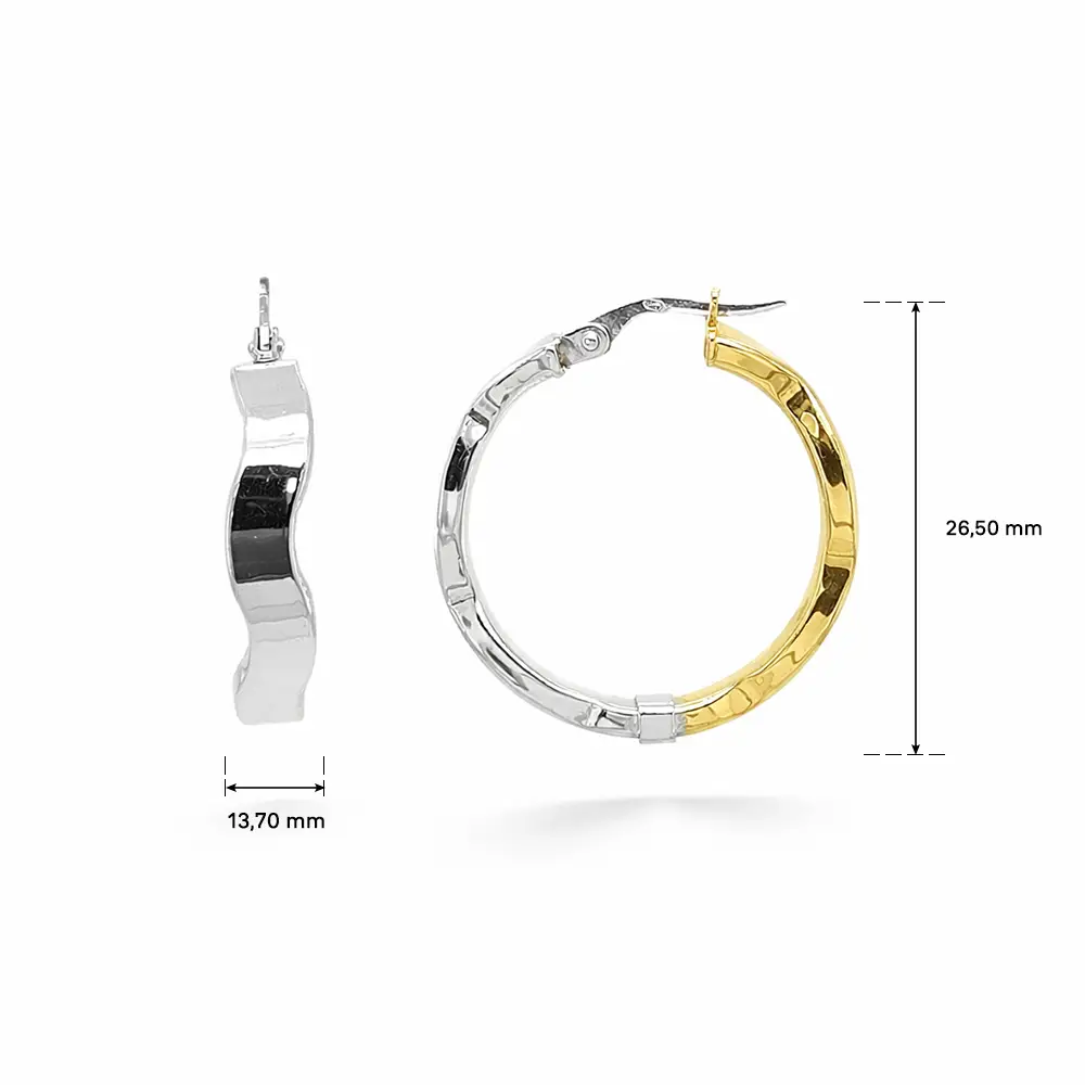 Эти кольцевые серьги из комбинированного золота привлекают внимание элегантным сочетанием двух оттенков золота и мягко волнистым профилем, который придаёт классической форме современный и динамичный характер. Полированная поверхность красиво отражает свет и подчёркивает контраст между деталями.