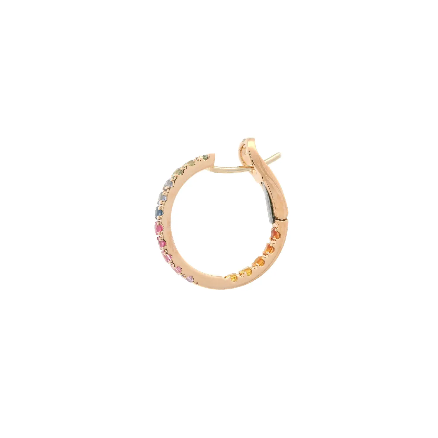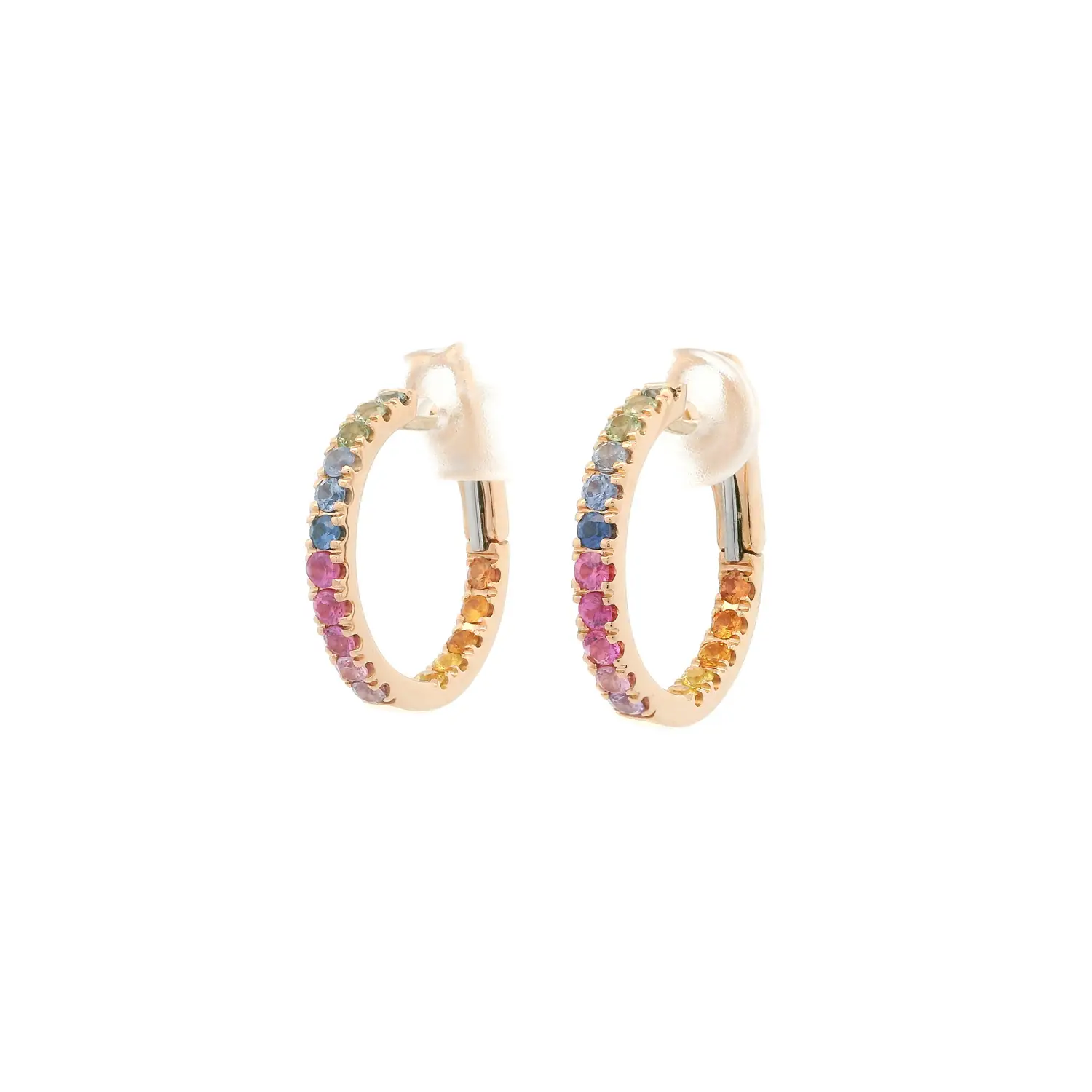 Эти кольцевые серьги из розового золота 18 карат с цветными сапфирами сочетают игривость и изысканную элегантность. Каждый сапфир тщательно огранён и закреплён так, чтобы подчеркнуть его естественный оттенок — от нежно-голубого и розового до солнечно-жёлтого и оранжевого. В итоге создаётся гармоничная радуга цветов, придающая украшению яркость и настроение.