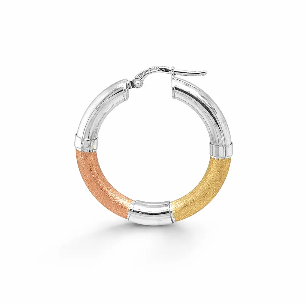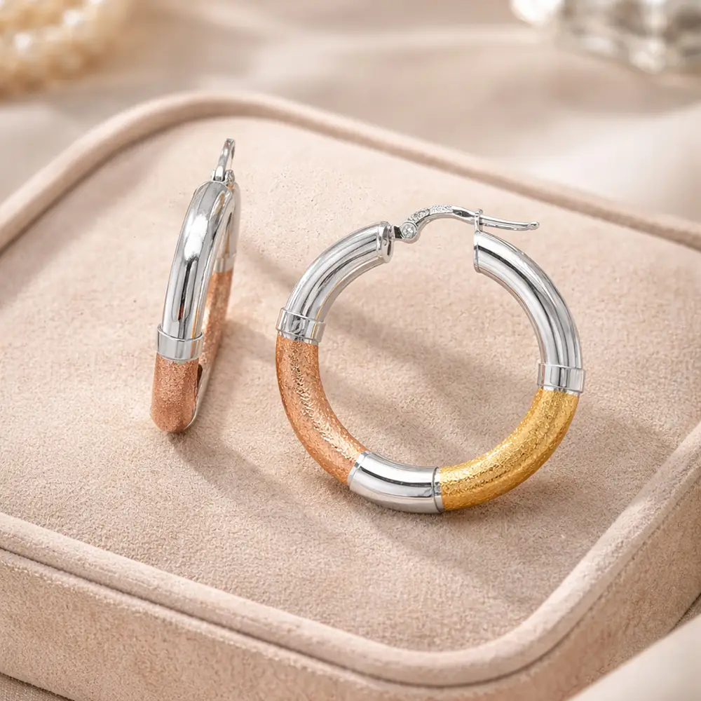 Эти кольцевые серьги из трёхцветного золота привлекают внимание элегантным сочетанием белого, жёлтого и розового золота, создающим гармоничный и вневременной образ. Тонко структурированная поверхность отдельных сегментов придаёт украшению глубину и изысканный характер, а классическая круглая форма выглядит сбалансированно и элегантно.