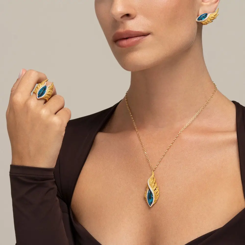 Центральным элементом является голубой топаз весом 7,37 карата, поражающий глубиной и сиянием. Его дополняют 38 бриллиантов общим весом 0,61 карата, создавая утончённый блеск.