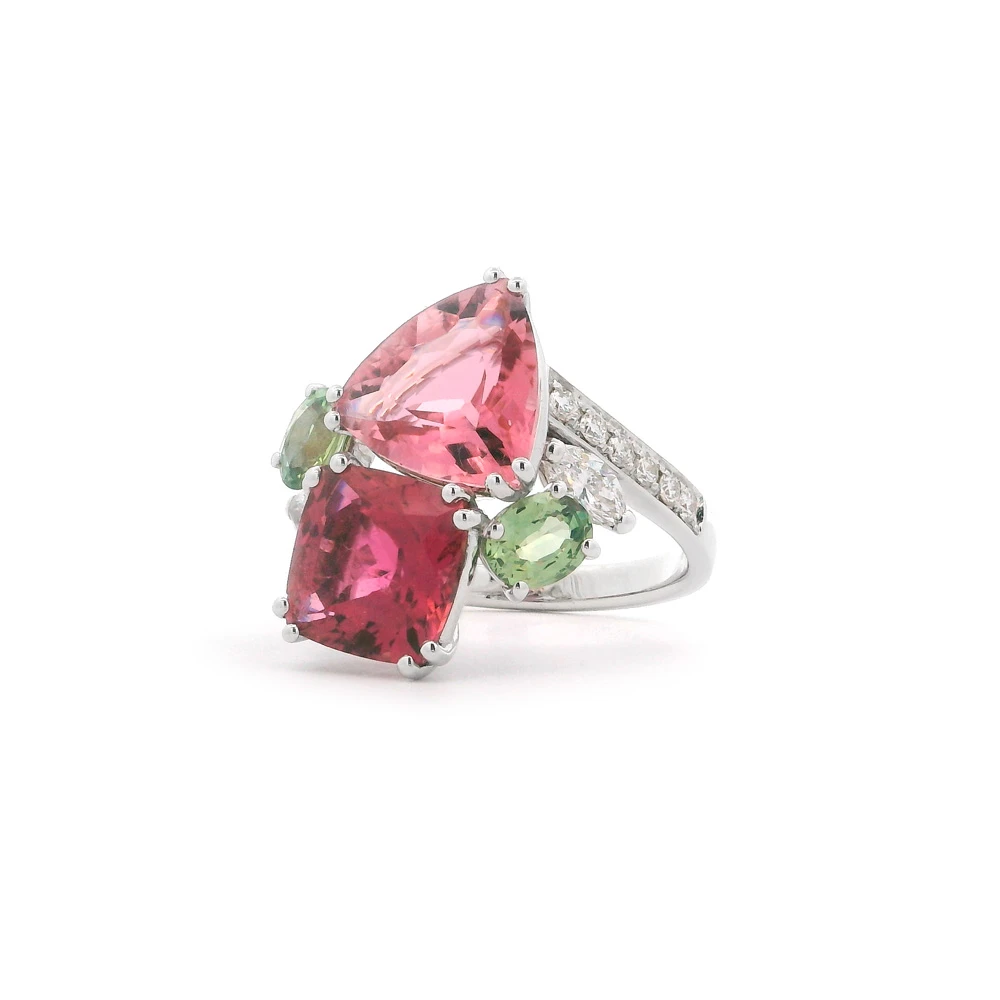 Это изысканное кольцо выполнено из белого золота 18 карат и поражает игрой цветов и форм. В центре композиции — два эффектных турмалина розовых оттенков, огранённых в необычные формы, которые притягивают внимание своей яркостью и блеском.