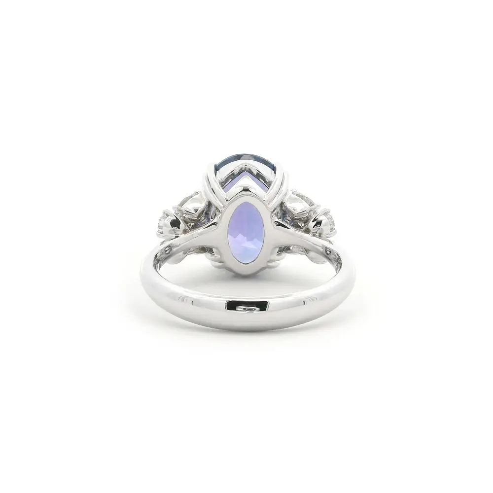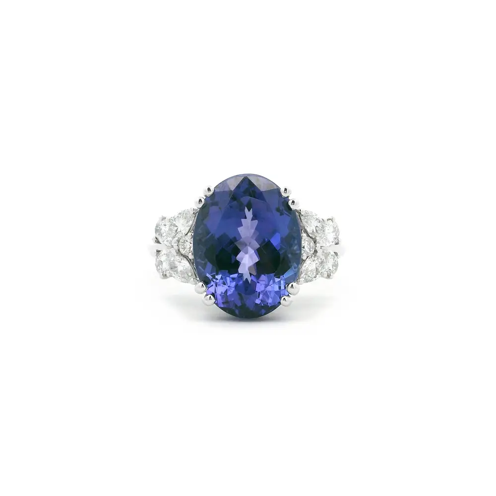 Это элегантное кольцо из 18-каратного белого золота сочетает утончённость и роскошь. В центре расположен овальный танзанит, чарующий переливами синего и фиолетового оттенков — символ индивидуальности и внутренней силы.