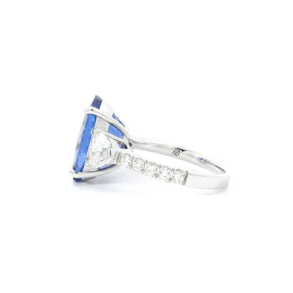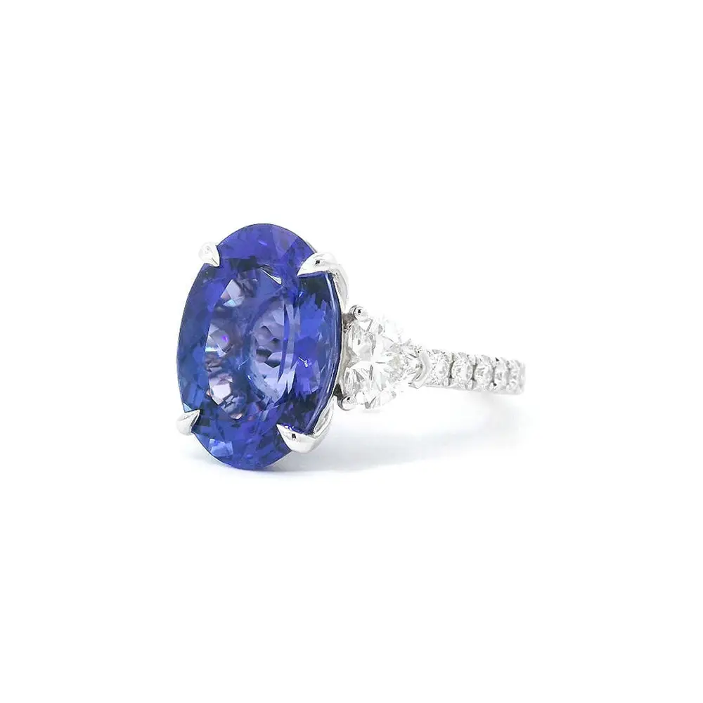 Это исключительное кольцо из белого золота 18 карат - торжество редкости, элегантности и женской силы. Доминантой украшения является прекрасный овальный танзанит весом 9,11 карата, чей глубокий фиолетово-синий оттенок очаровывает с первого взгляда.
