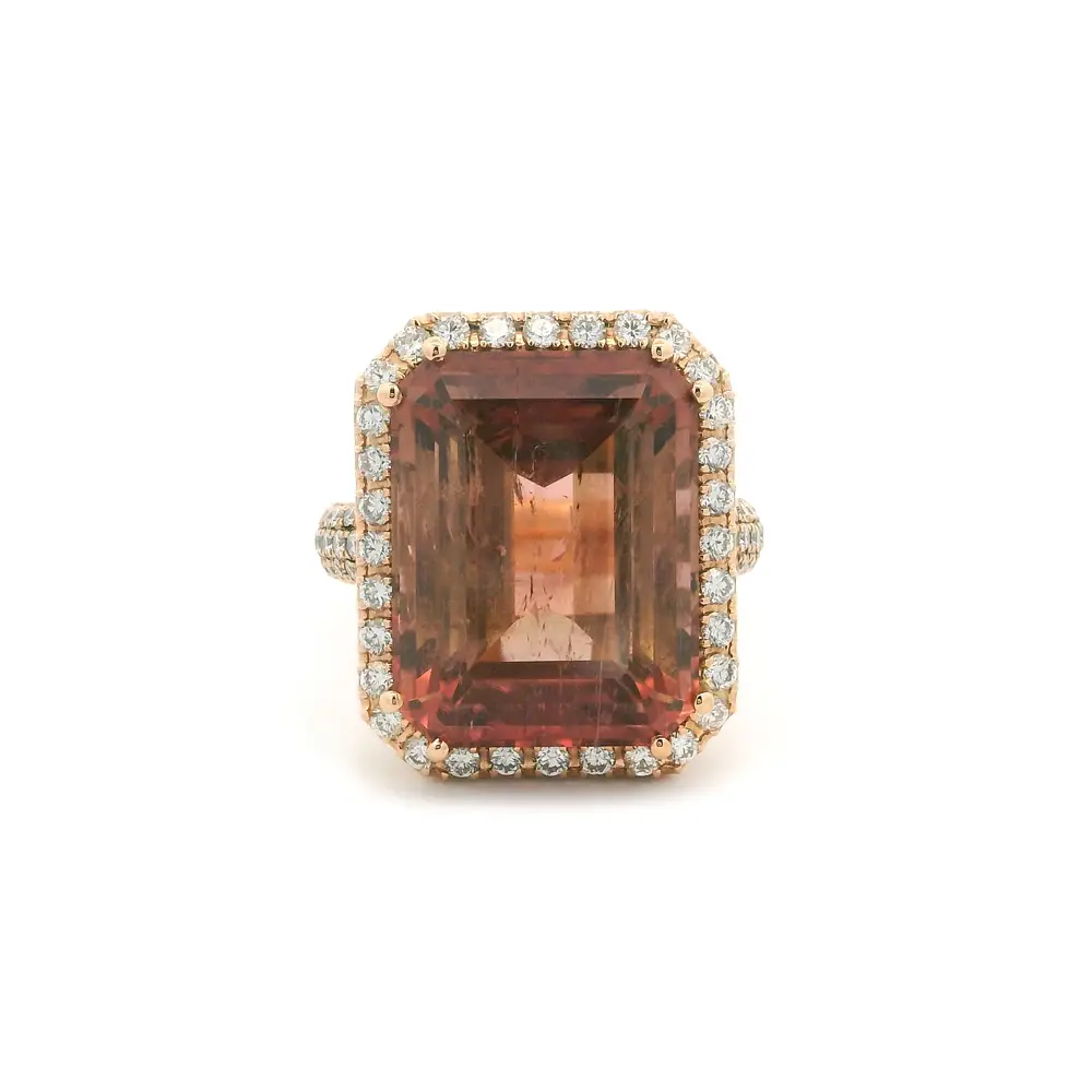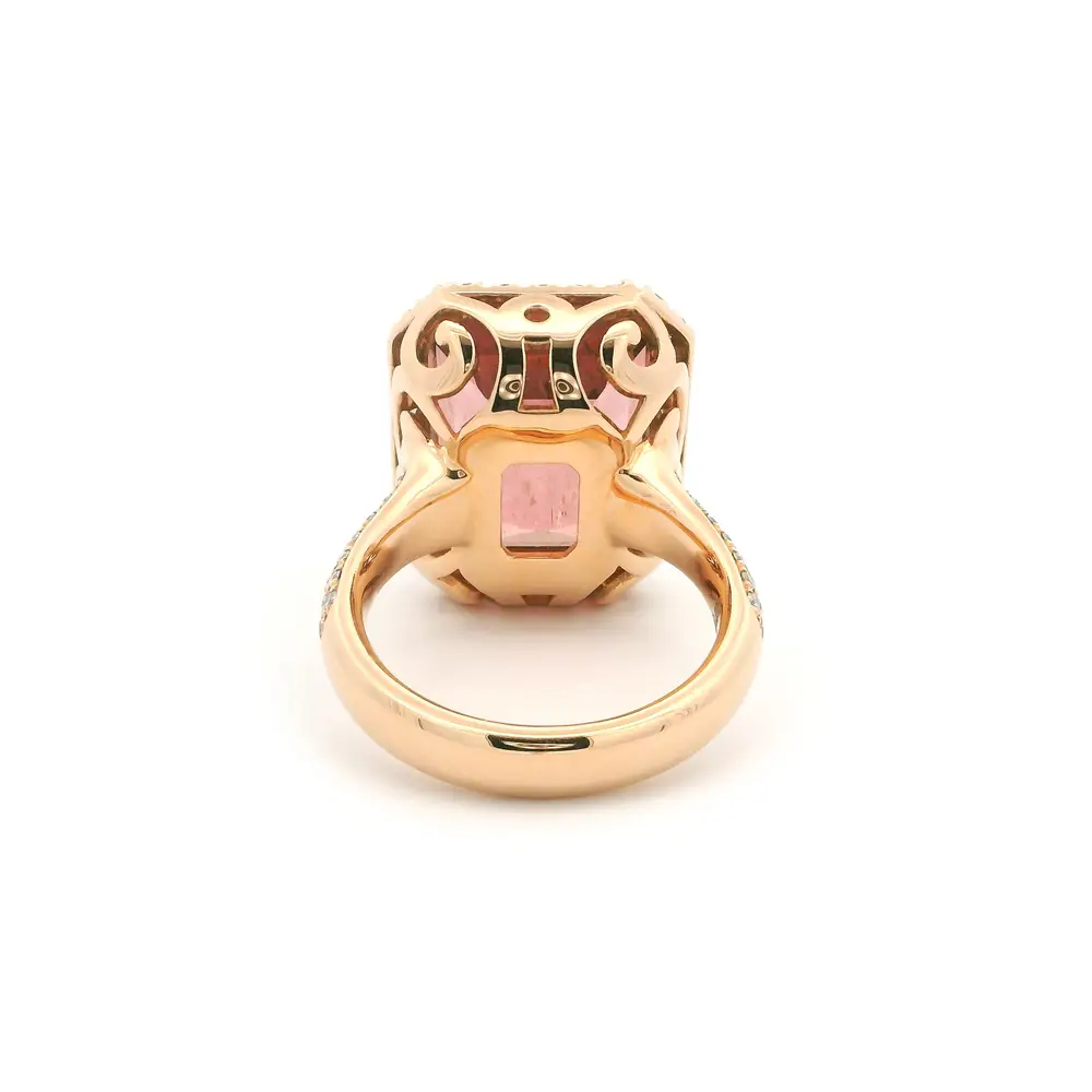 Элегантное кольцо из розового золота 18 карат воплощает женственность и изысканность. В центре сияет розовый турмалин изумрудной огранки, переливающийся мягкими тёплыми оттенками и естественным блеском при каждом движении.