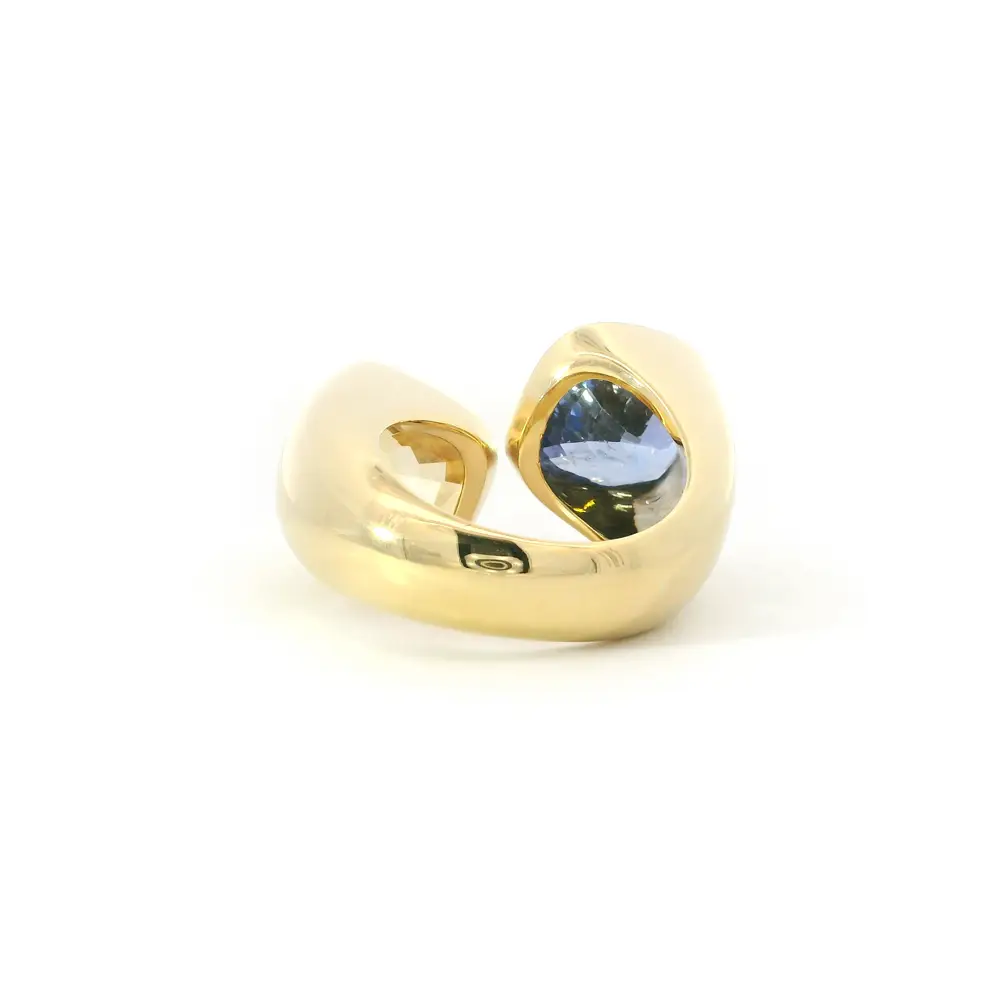 Это оригинальное кольцо изготовлено из жёлтого золота 18 карат (750/1000) и украшено парой редких сапфиров контрастных оттенков – насыщенно-синего и солнечно-жёлтого. Вместе они создают гармоничную игру света и цвета, превращая кольцо в подлинный шедевр для особых случаев.