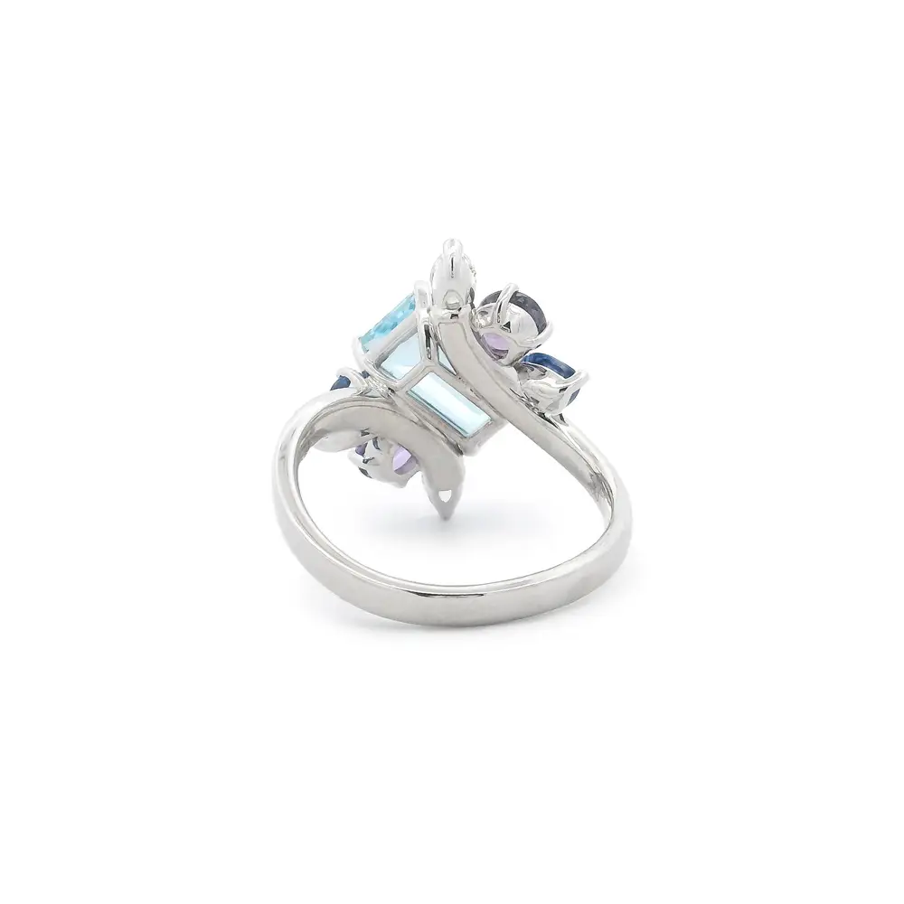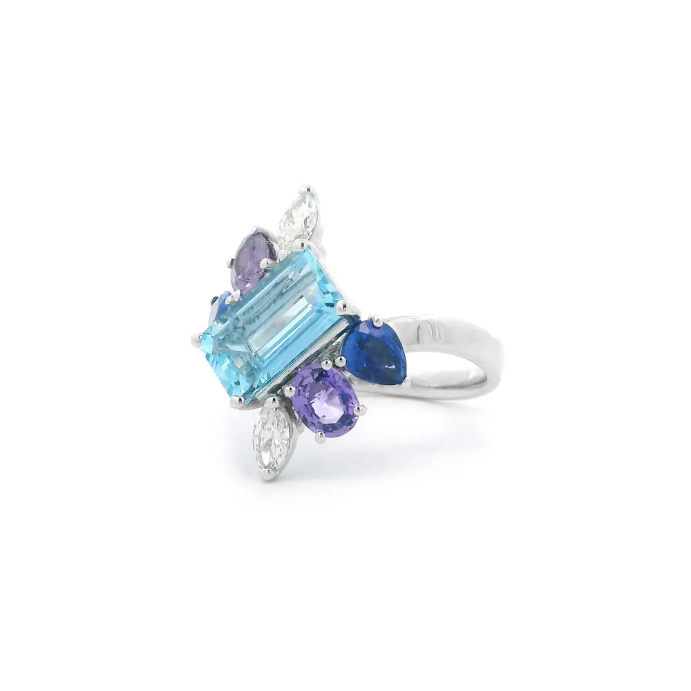 Кольцо с аквамарином, сапфирами и бриллиантами в роскошном дизайне