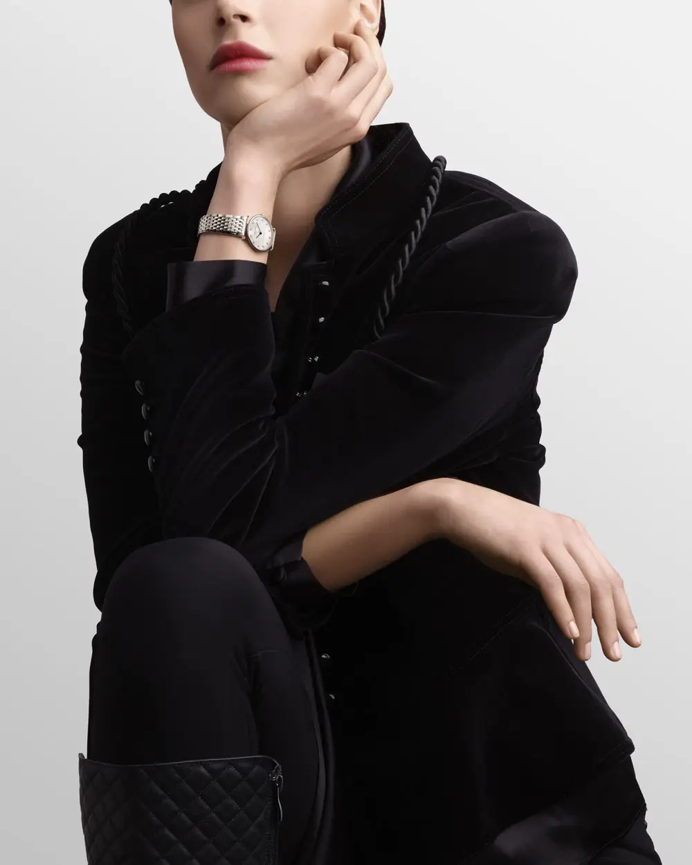 Циферблат из изысканного белого перламутра украшен 12 бриллиантовыми метками (0,081 карата), придающими часам роскошное сияние и женственный характер. Контрастные чёрные стрелки обеспечивают превосходную читаемость и подчеркивают классический дизайн коллекции La Grande Classique.