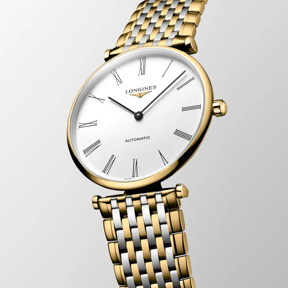 Внутри работает автоматический калибр L591 с запасом хода до 45 часов, обеспечивающий точность и техническую надёжность. Модель дополнена браслетом из стали с жёлтым PVD-покрытием и тройной раскладывающейся застёжкой, сочетающей комфорт, элегантность и безопасность. Эти часы идеально выражают ценности Longines — традиции, качество и вечную красоту.