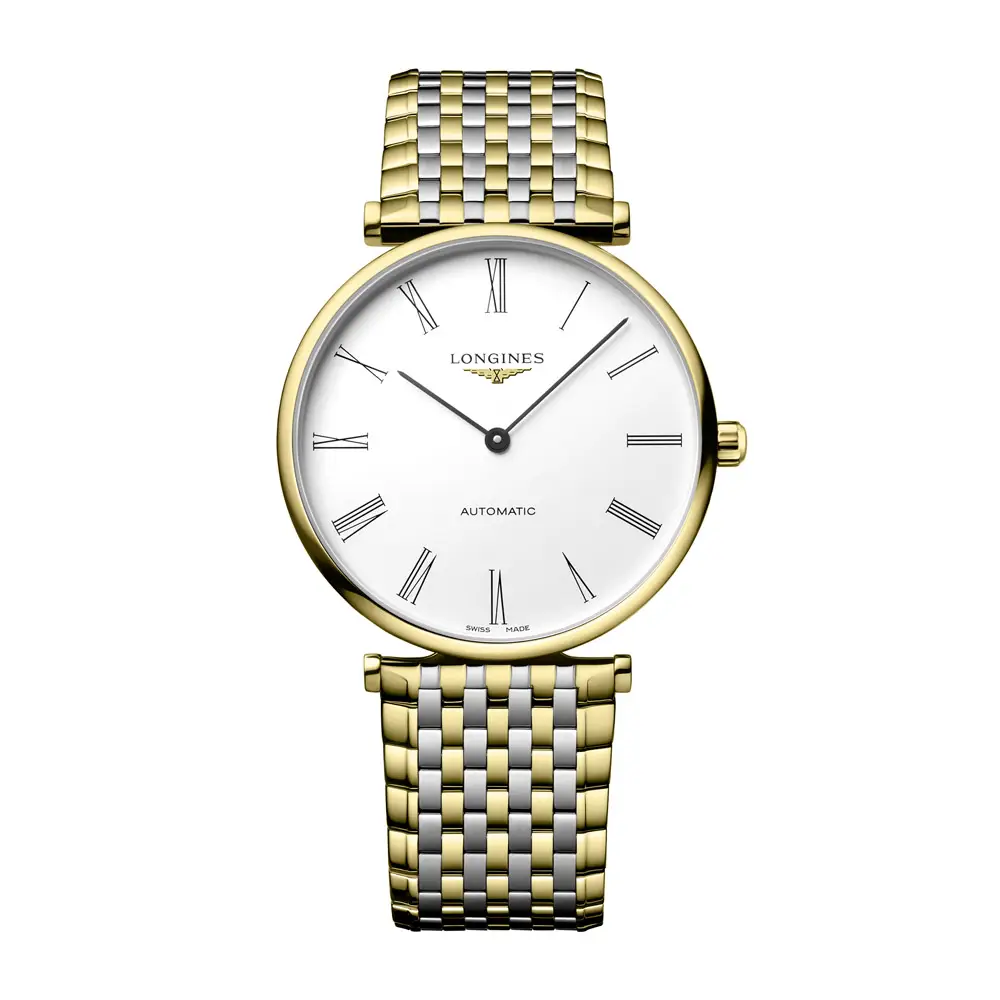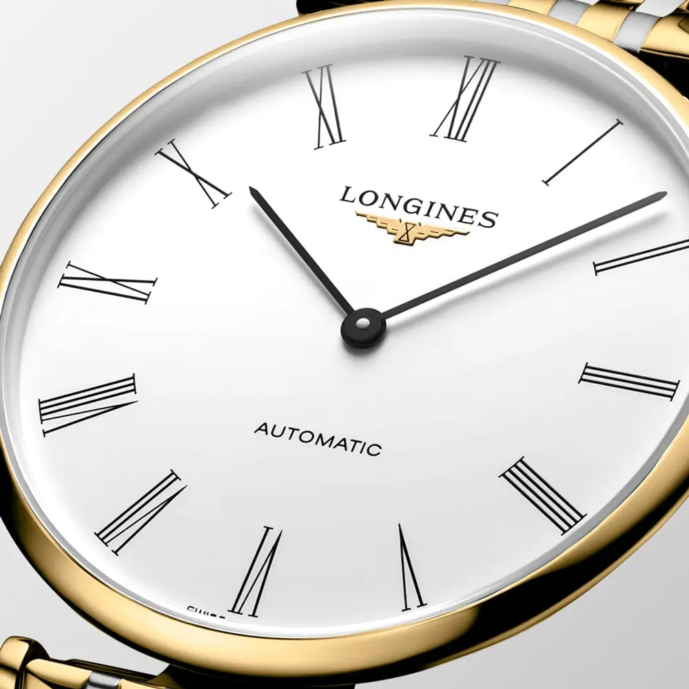 Белый циферблат с чёрными римскими цифрами и тонкими стрелками подчёркивает вечный дизайн коллекции La Grande Classique. Прозрачная задняя крышка открывает вид на изысканно декорированный механизм, отражающий швейцарское наследие Longines.
