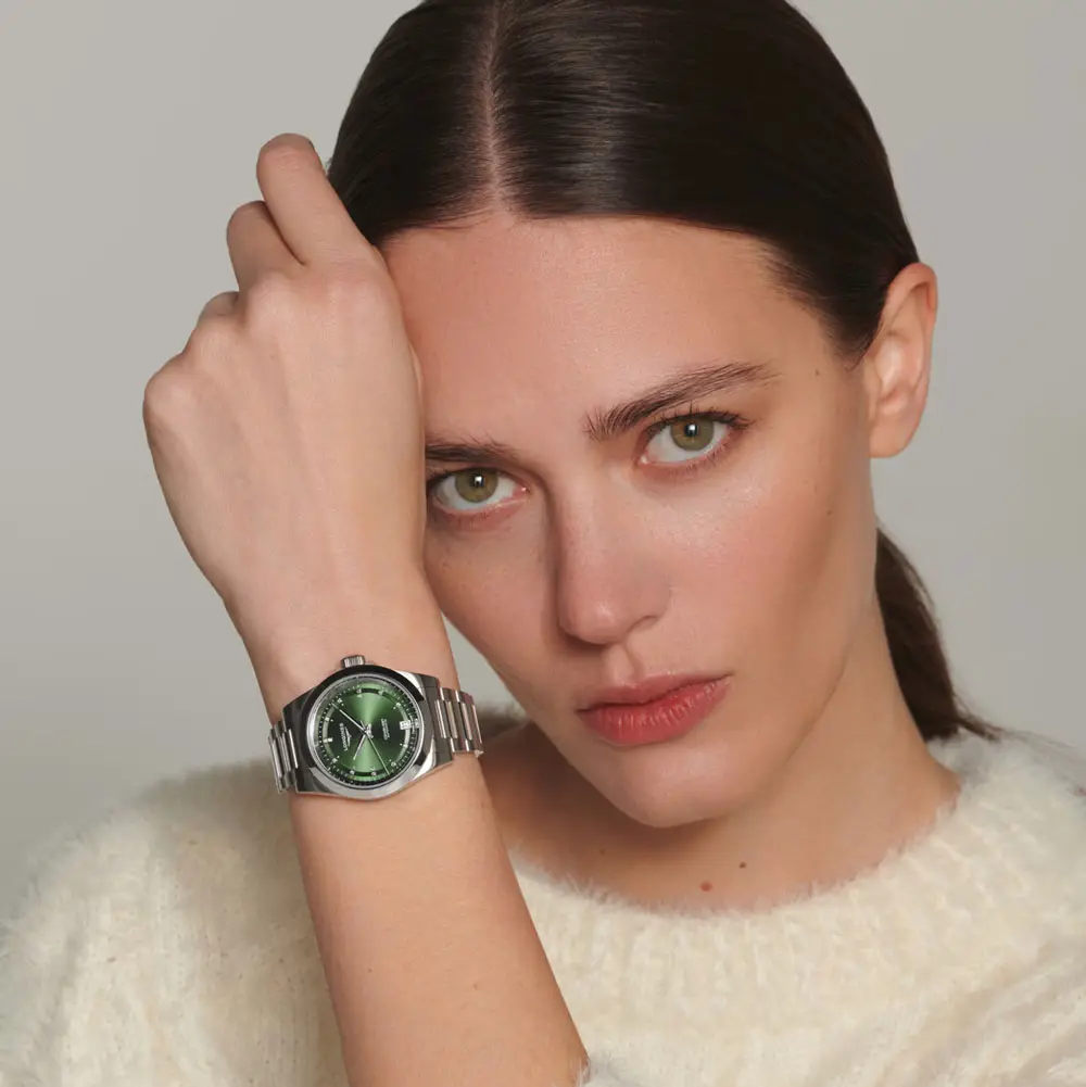 Зелёный циферблат Sunray украшен 14 бриллиантовыми индексами (0,035 ct) и дополнен серебристыми люминесцентными стрелками. Практичное окно даты на 6 часах создаёт гармонию между эстетикой и функциональностью, а свежий цвет циферблата добавляет индивидуальности и стиля.