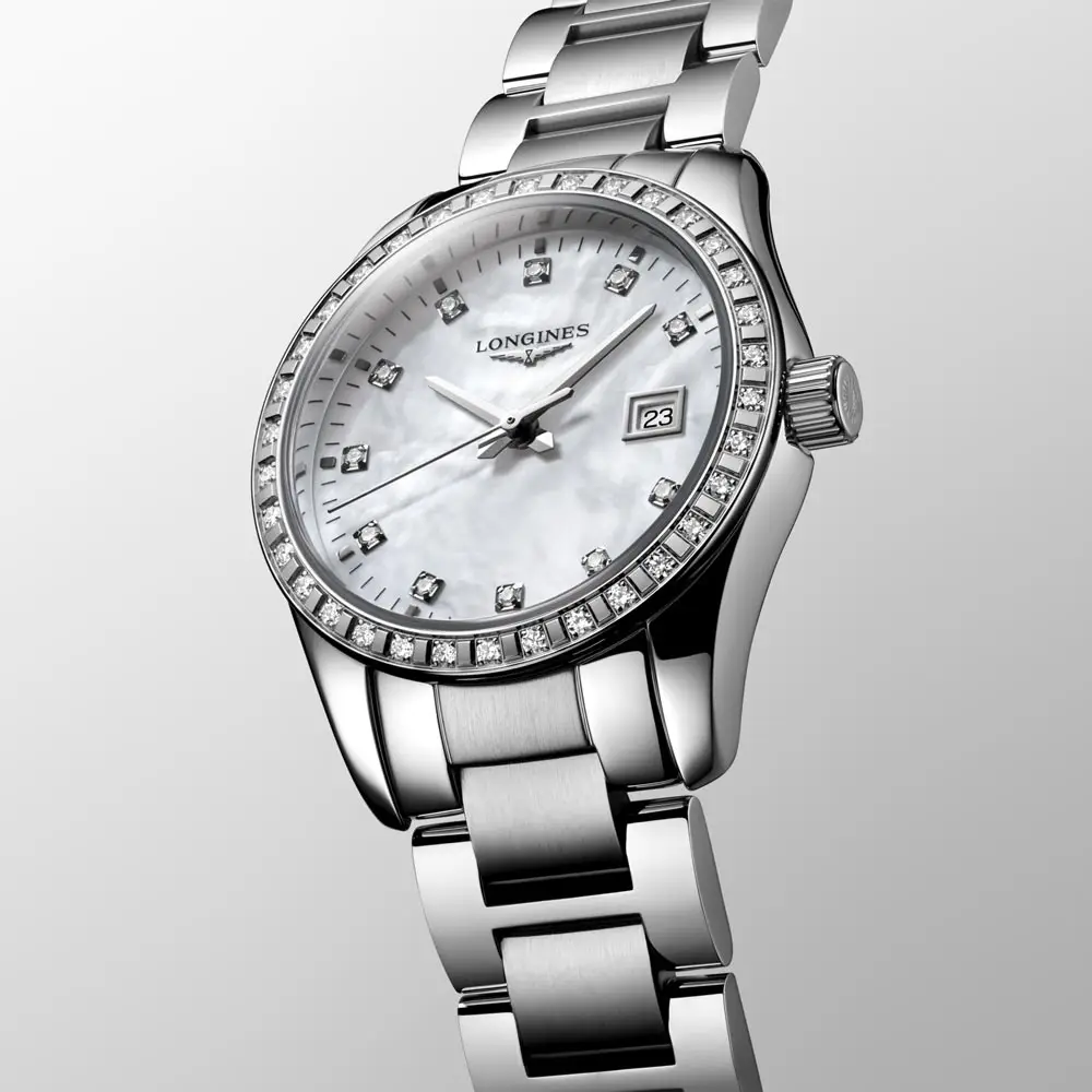 Longines Conquest Classic L2.286.0.87.6 сочетает в себе женственную элегантность и современную функциональность, отражая многолетние традиции Longines в создании стильных и точных часов. Круглый корпус из полированной нержавеющей стали диаметром 29,5 мм выглядит изящно и выразительно благодаря безелю, украшенному бриллиантами, придающему модели нотку роскоши.