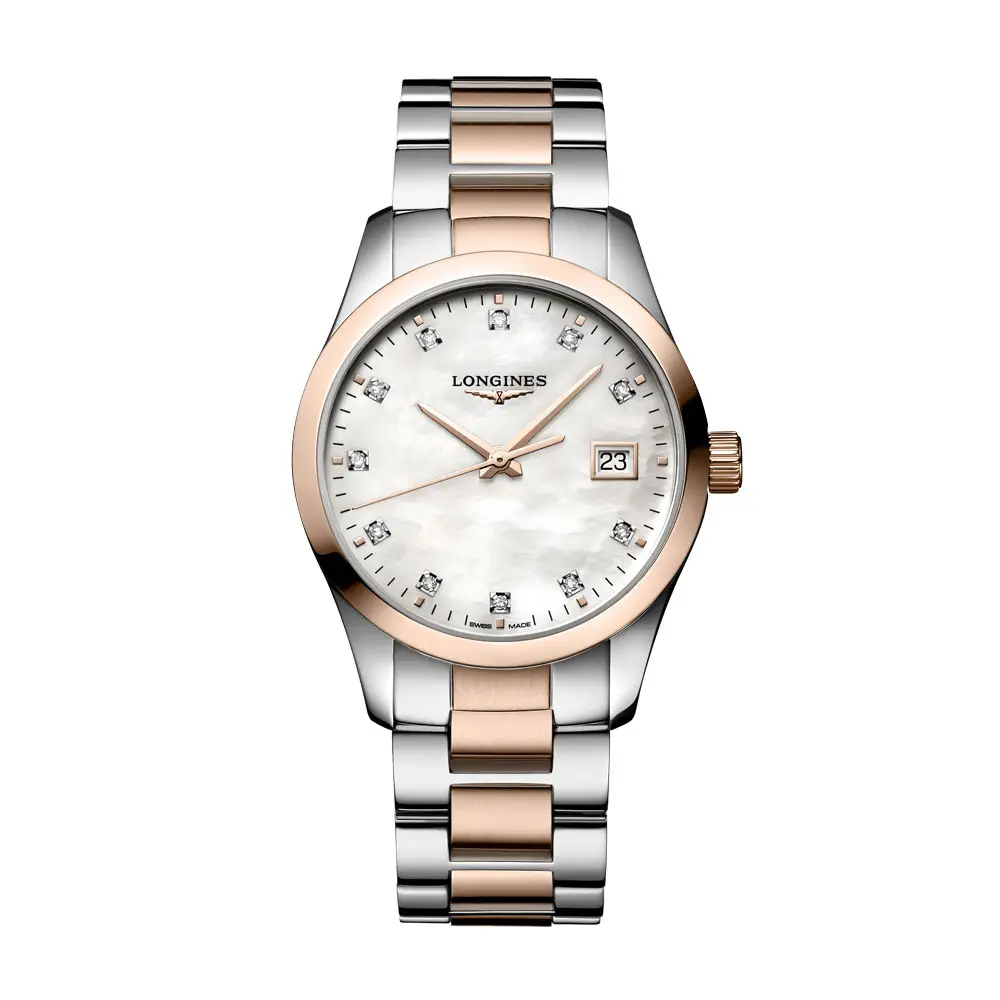 Longines Conquest Classic L2.386.3.87.7 — элегантная женская модель из культовой линии Conquest, сочетающая ювелирные акценты и практичность. Корпус диаметром 34 мм из нержавеющей стали с изысканным красным PVD-покрытием обрамляет белый перламутровый циферблат, украшенный 11 бриллиантовыми метками. У отметки «3 часа» расположено аккуратное окошко даты.