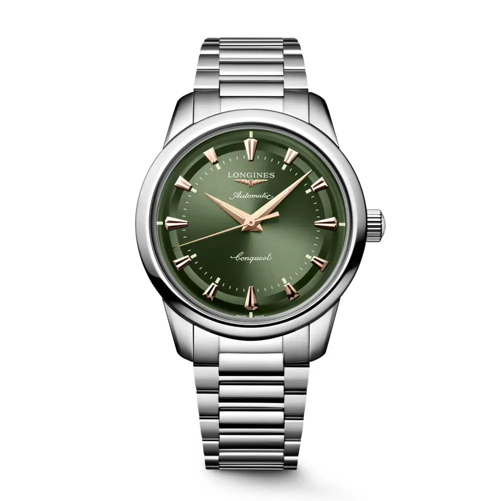 Часы Longines Conquest Heritage 40 mm - это дань уважения классическому дизайну бренда 1950-х годов, воплотившему элегантность и неподвластность времени в современной концепции. 40-миллиметровый корпус из нержавеющей стали дополнен мягко изогнутым сапфировым стеклом с антибликовым покрытием. С первого взгляда привлекает внимание лакированный зеленый циферблат с эффектом солнечных лучей, с полированными индексами и стрелками с люминесцентным покрытием Super-LumiNova®.