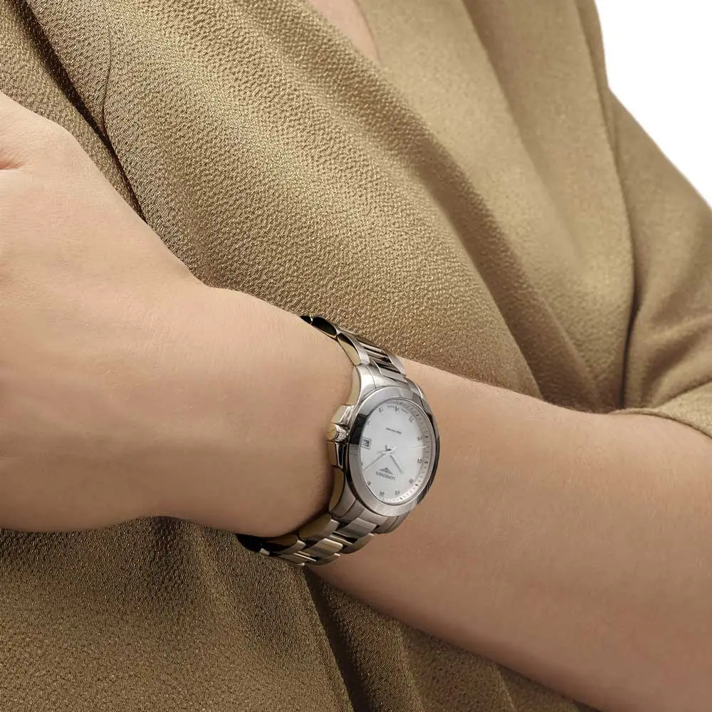 Перламутровый циферблат инкрустирован бриллиантовыми индексами, придающими роскошное сияние и уникальный характер. Изящные серебристые стрелки с люминесцентным покрытием обеспечивают отличную читаемость даже в темноте, а окно даты на отметке 3 часа повышает удобство.