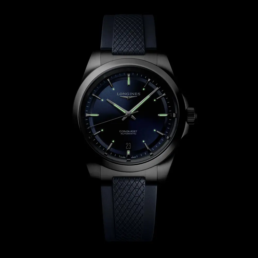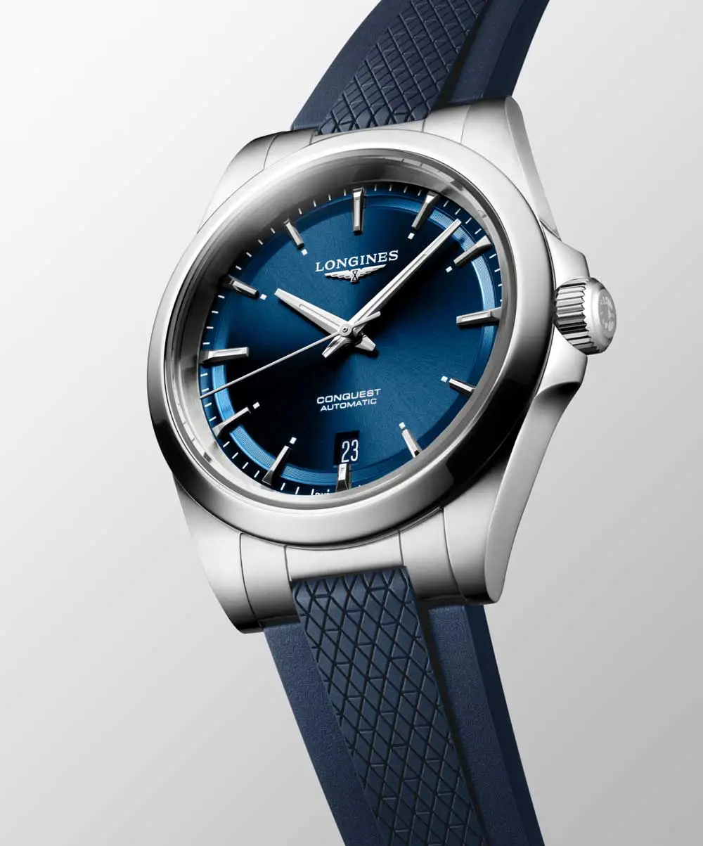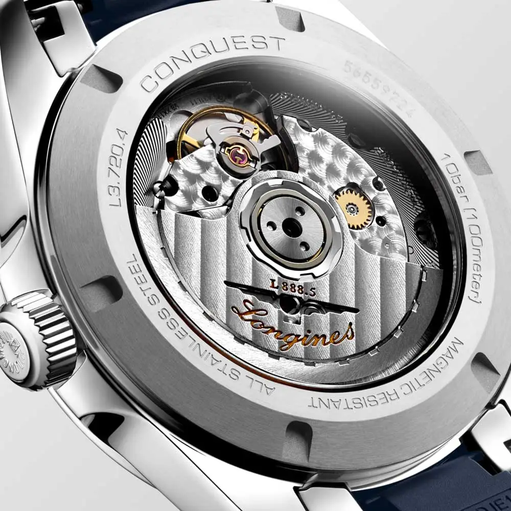 Внутри находится мощный автоматический механизм L888.5 с запасом хода до 72 часов, оснащенный силиконовой нитью для большей устойчивости к воздействию магнитных полей. Часы оснащены синим каучуковым ремешком с раскладывающейся застежкой и системой микрорегулировки, которая обеспечивает комфорт даже во время занятий спортом. Таким образом, Longines Conquest - это надежная работа, неподвластный времени стиль и швейцарская точность в одном лице.