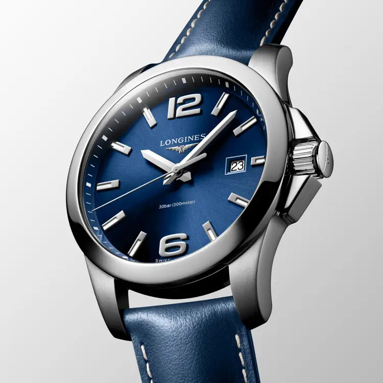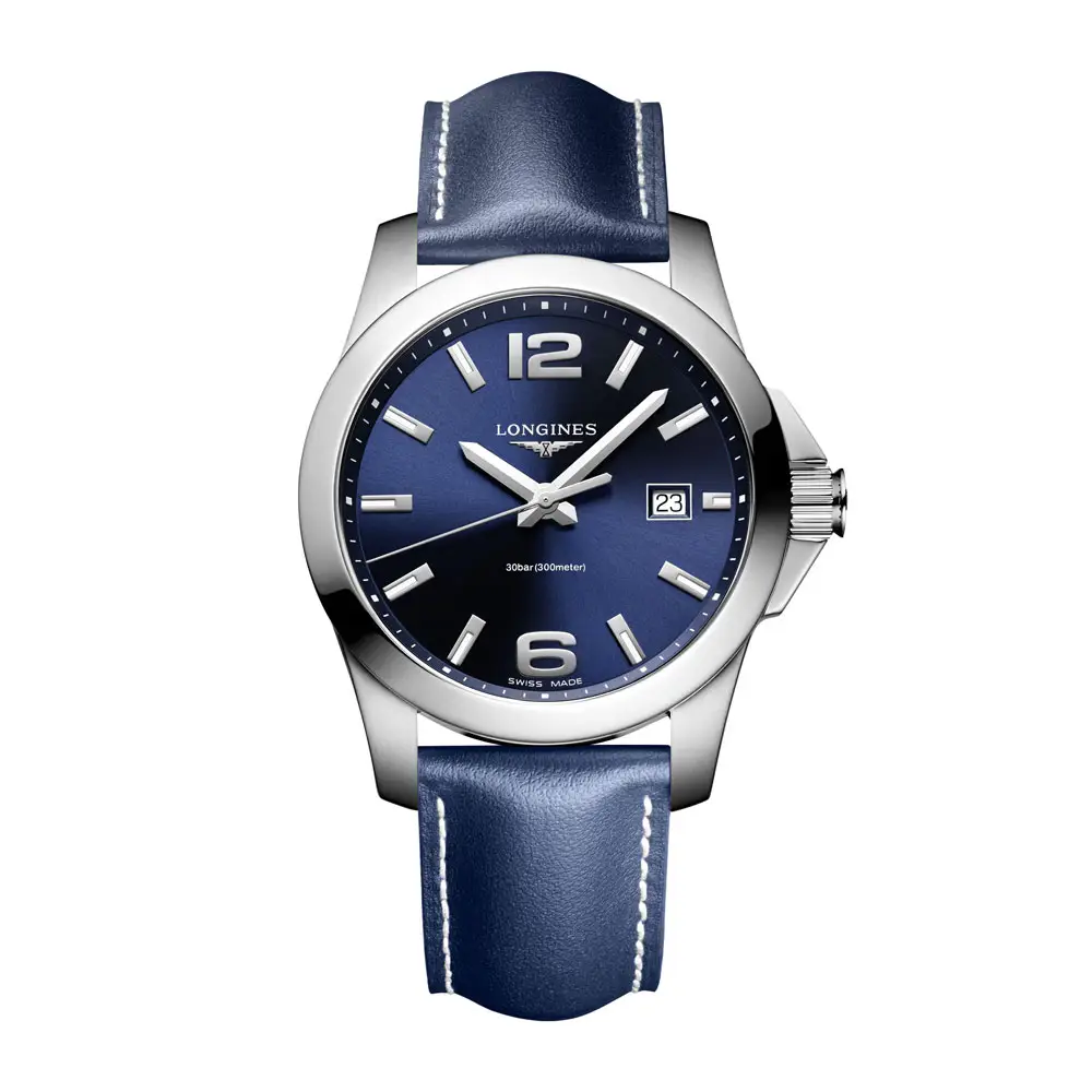 Синий кожаный ремешок с раскладывающейся застёжкой обеспечивает комфорт и изысканный внешний вид. Longines Conquest L3.759.4.96.0 — идеальный выбор для мужчин, ищущих спортивную функциональность, элегантный дизайн и швейцарскую надёжность.