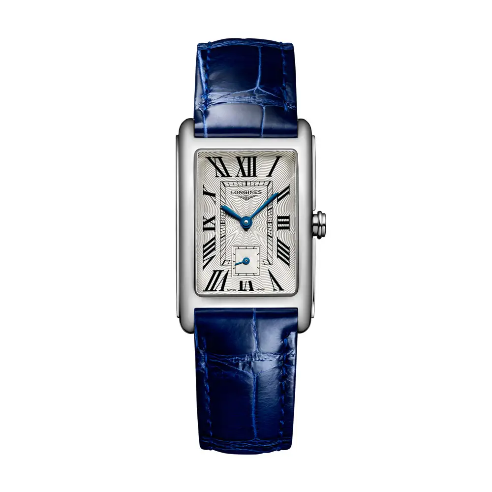 Longines DolceVita L5.512.4.71.7 — элегантные женские часы в классическом прямоугольном корпусе, сочетающие традицию и изящество современных деталей. Корпус из нержавеющей стали размером 23,30 × 37,00 мм обрамляет серебристый циферблат «flinqué» с синими стрелками и римскими цифрами, подчеркивающими вечный шарм модели.