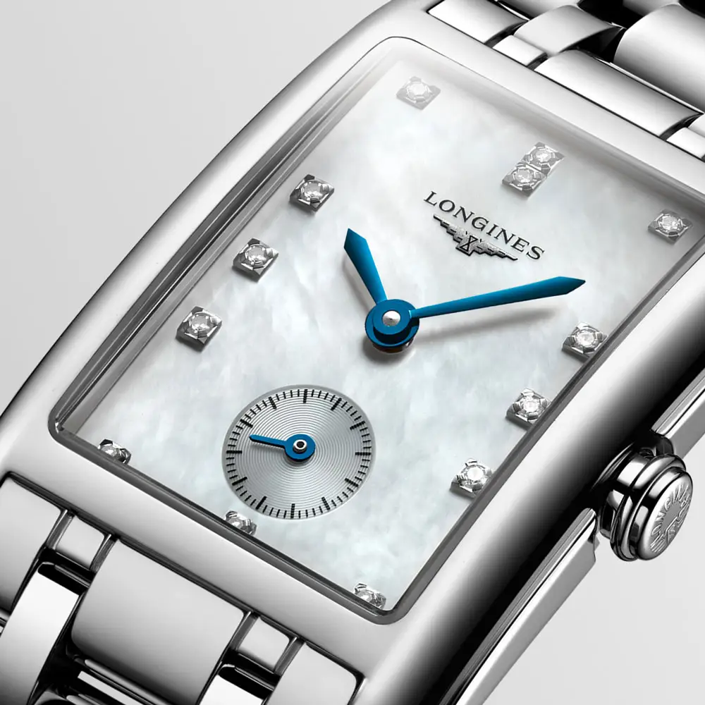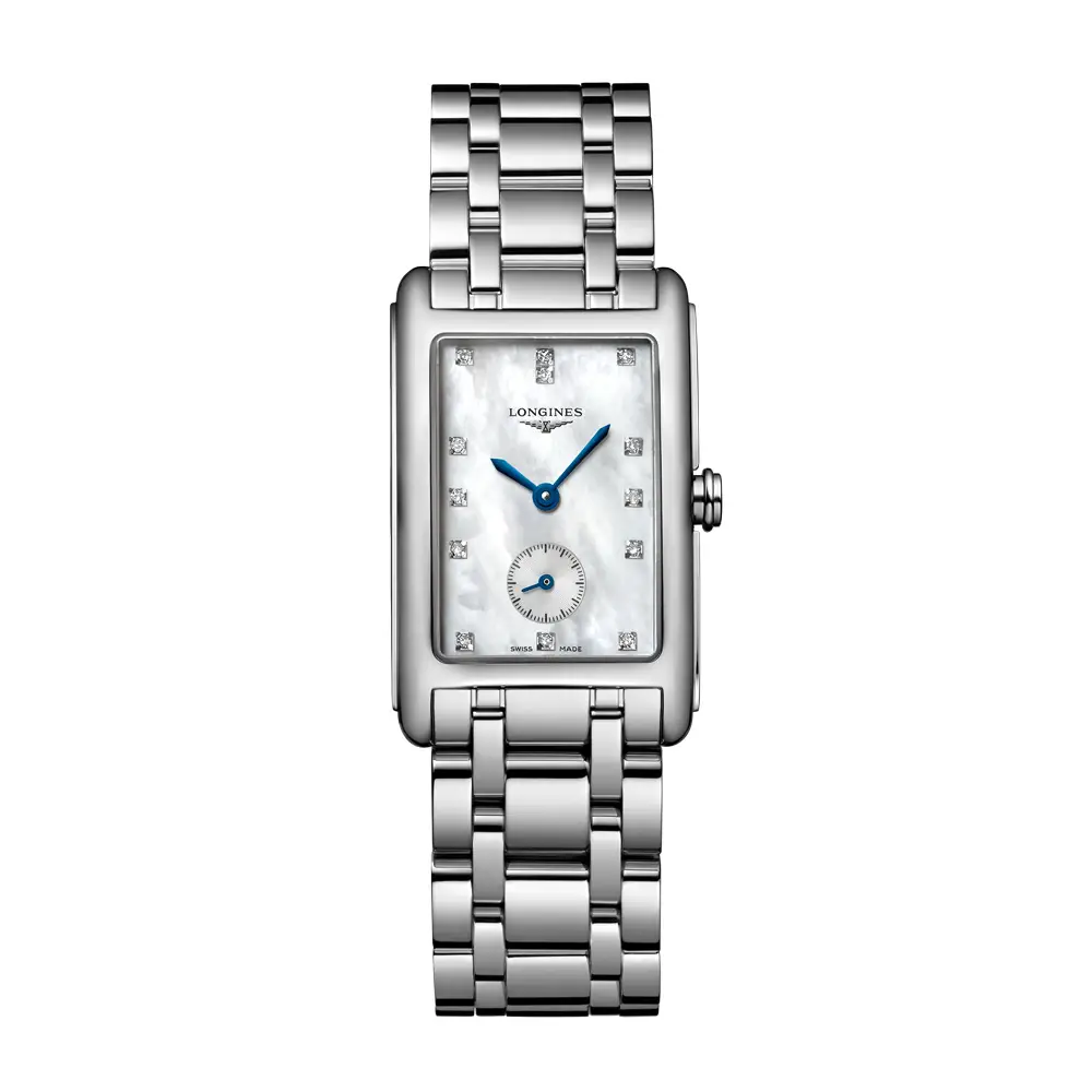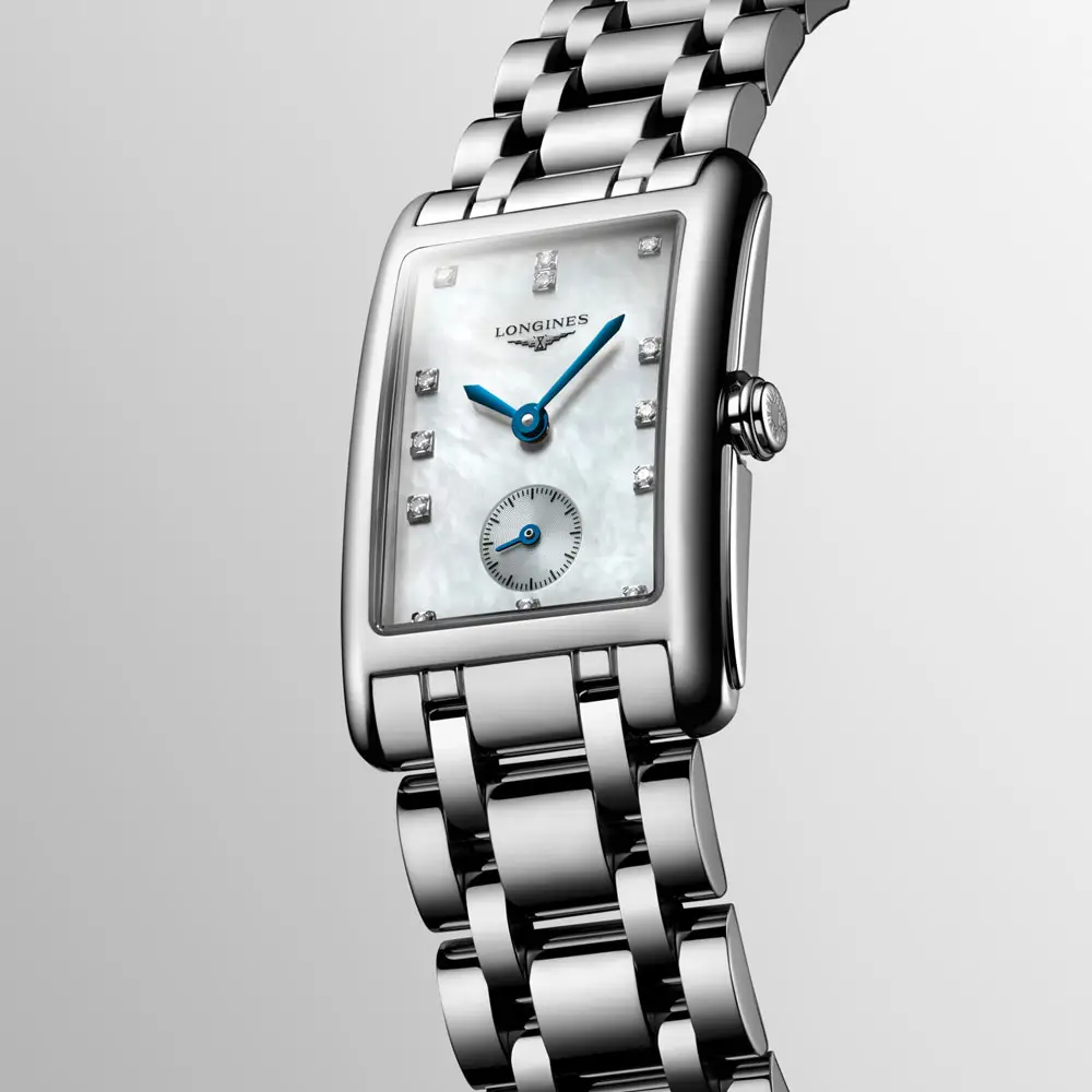 Longines DolceVita L5.512.4.87.6 — элегантные женские часы, сочетающие классические линии коллекции DolceVita с утончённым современным акцентом. Корпус из нержавеющей стали размером 23,30 × 37,00 мм обрамляет циферблат с изящными деталями, подчеркивающими его утончённый характер.