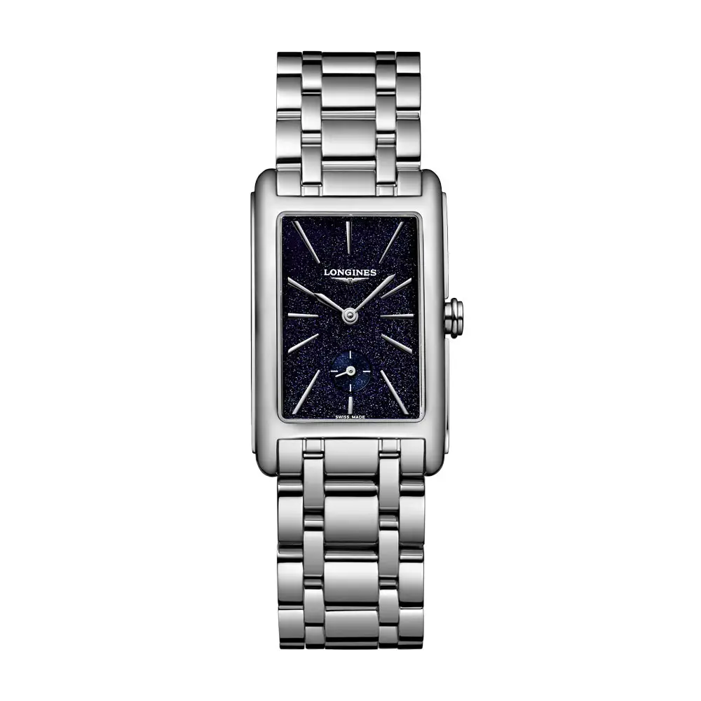 Longines DolceVita L5.512.4.93.6 — женские часы, сочетающие элегантный прямоугольный дизайн с современными цветовыми акцентами. Корпус из нержавеющей стали размером 23,30 × 37,00 мм обрамляет насыщенный синий циферблат с изящными индексами и малой секундной стрелкой на позиции «6 часов», придающими модели индивидуальность.