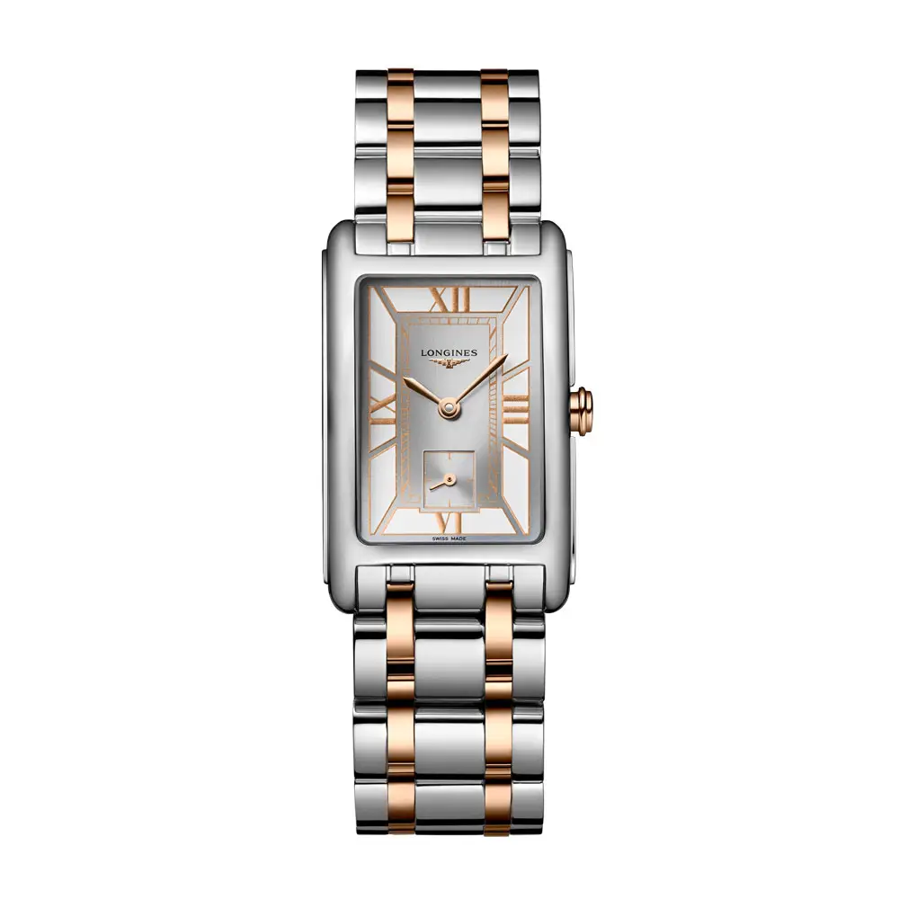 Longines DolceVita L5.512.5.75.7 — женские часы, сочетающие элегантность коллекции DolceVita с изысканным двухцветным дизайном. Корпус из нержавеющей стали размером 23,30 × 37,00 мм дополнен заводной головкой из розового золота 18 карат, а белый циферблат с римскими цифрами и малой секундной стрелкой на позиции «6 часов» подчеркивает классический характер модели.