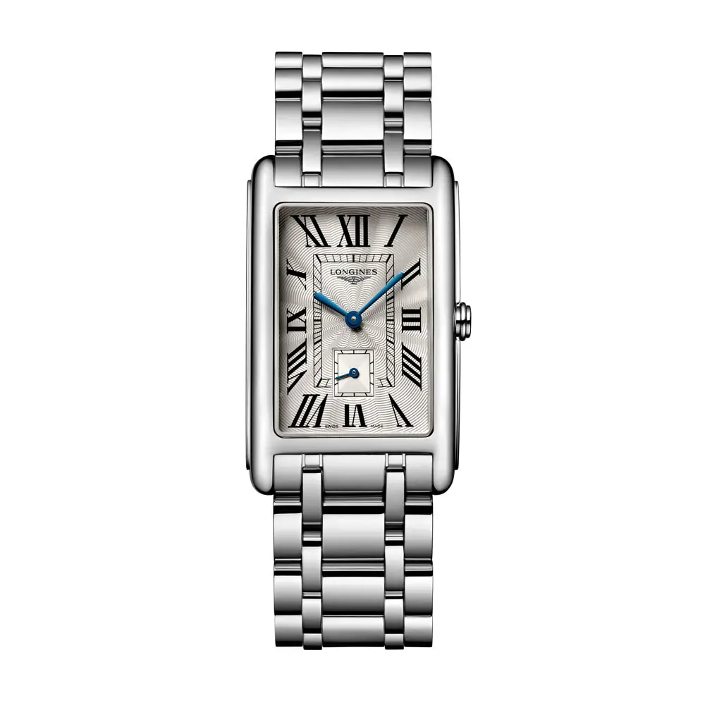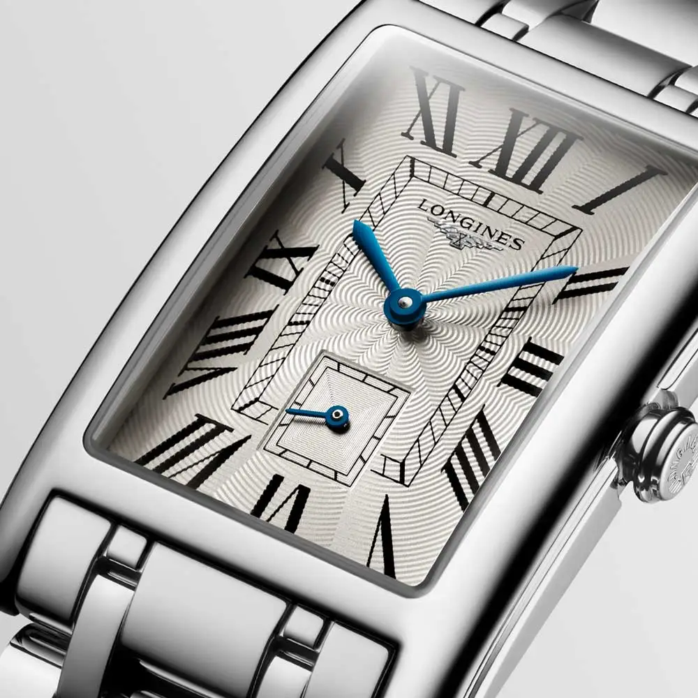 Longines DolceVita L5.755.4.71.6 — это изящные женские часы среднего размера, сочетающие классический прямоугольный дизайн и вечную элегантность. Корпус из нержавеющей стали 26,1 × 42,0 мм обрамляет серебристый циферблат «flinqué» с римскими цифрами и синими стрелками, придающими модели утончённый характер.