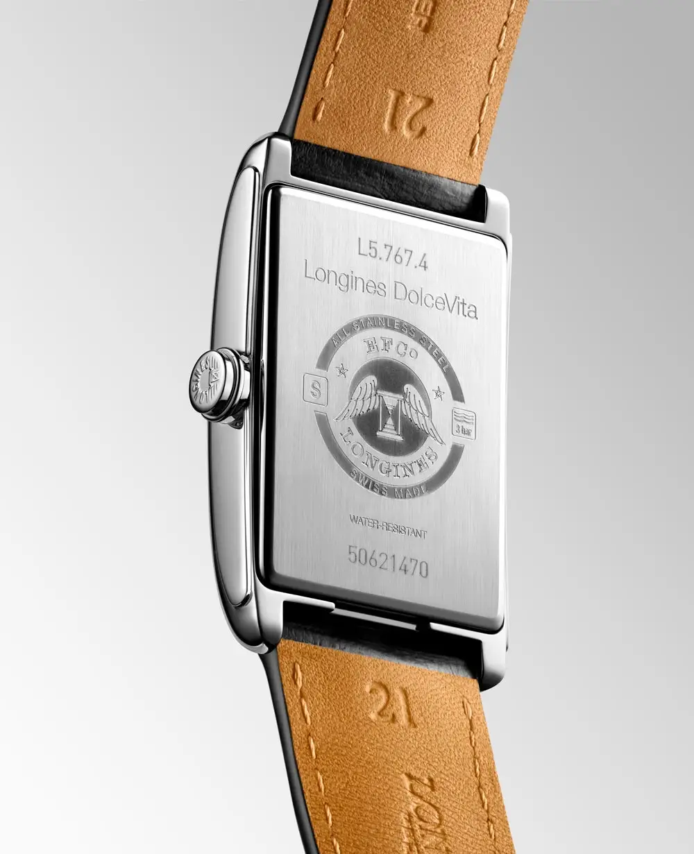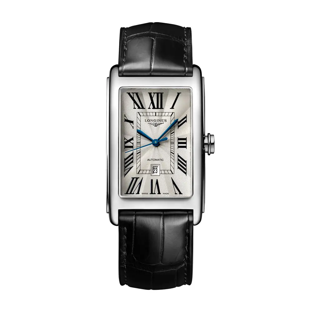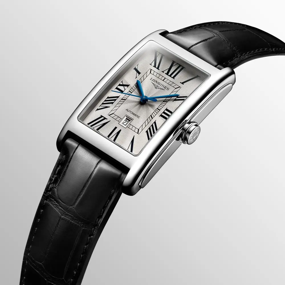 Longines DolceVita L5.767.4.71.0 — это автоматическая модель, продолжающая традиции культовой коллекции DolceVita в современной механической интерпретации. Корпус из нержавеющей стали размером 28,20 × 47,00 мм обрамляет серебристый циферблат «flinqué» с римскими цифрами и синими стрелками, подчеркивающими классическую элегантность.