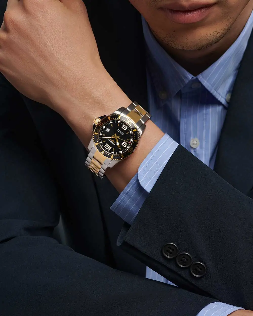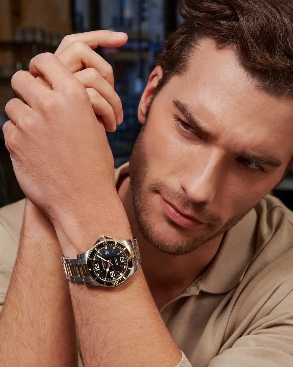 Longines HydroConquest L3.742.3.56.7 сочетает швейцарскую точность, спортивный характер и современную элегантность. Корпус из нержавеющей стали 41 мм дополнен безелем и браслетом с жёлтым PVD-покрытием, защищённым сапфировым стеклом с антибликовым покрытием. Благодаря водонепроницаемости до 30 бар (300 м), завинчивающейся заводной головке и одностороннему безелю часы идеально подходят для дайвинга.