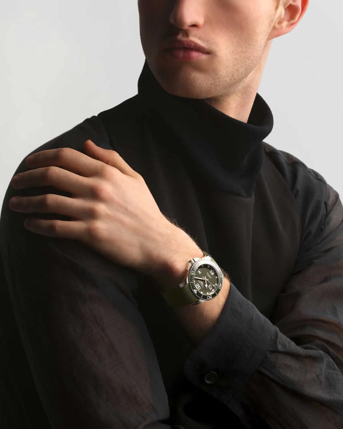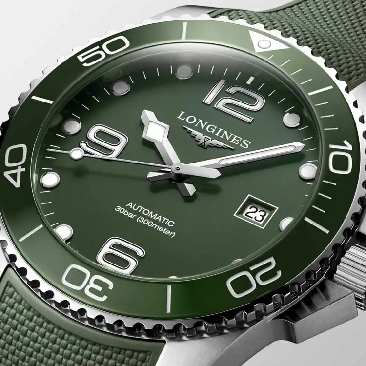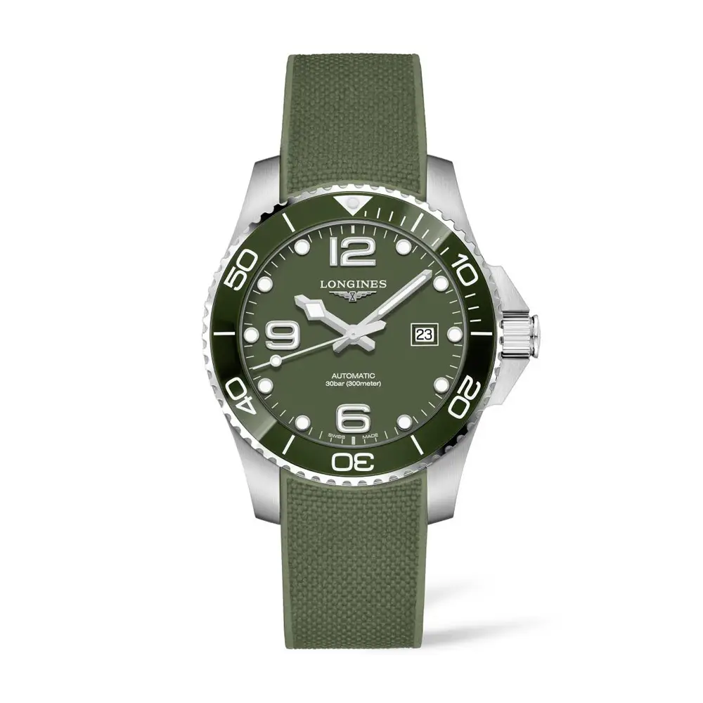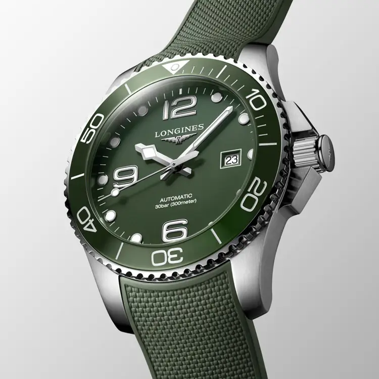 Зелёный каучуковый ремешок с раскладной застёжкой дополняет спортивный образ и обеспечивает комфорт в носке. Модель HydroConquest L3.782.4.06.9 — идеальный выбор для мужчин, ценящих высокую производительность, швейцарскую точность и современный стиль.