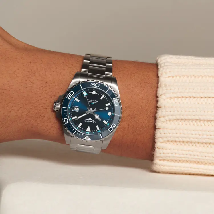 На запястье часы фиксируются стальным браслетом с раскладывающейся застёжкой, двойной системой безопасности и микро-регулировкой. HydroConquest GMT L3.790.4.96.6 – это выбор путешественников, которые ценят швейцарскую точность, технические инновации и надёжность под водой и на суше.